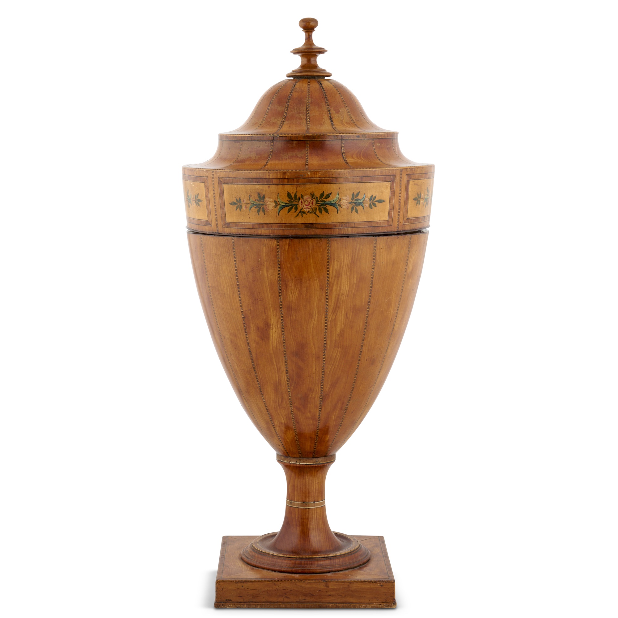 Of Classical urn shape with a domed and moulded cover and standing on a square plinth base, the frieze of the cover inlaid with rectangular fields decorated in colours with designs of flowering foliage, the exterior variously inlaid with feather-banding and cross-banding throughout, the interior retaining its stepped spoon dividers
