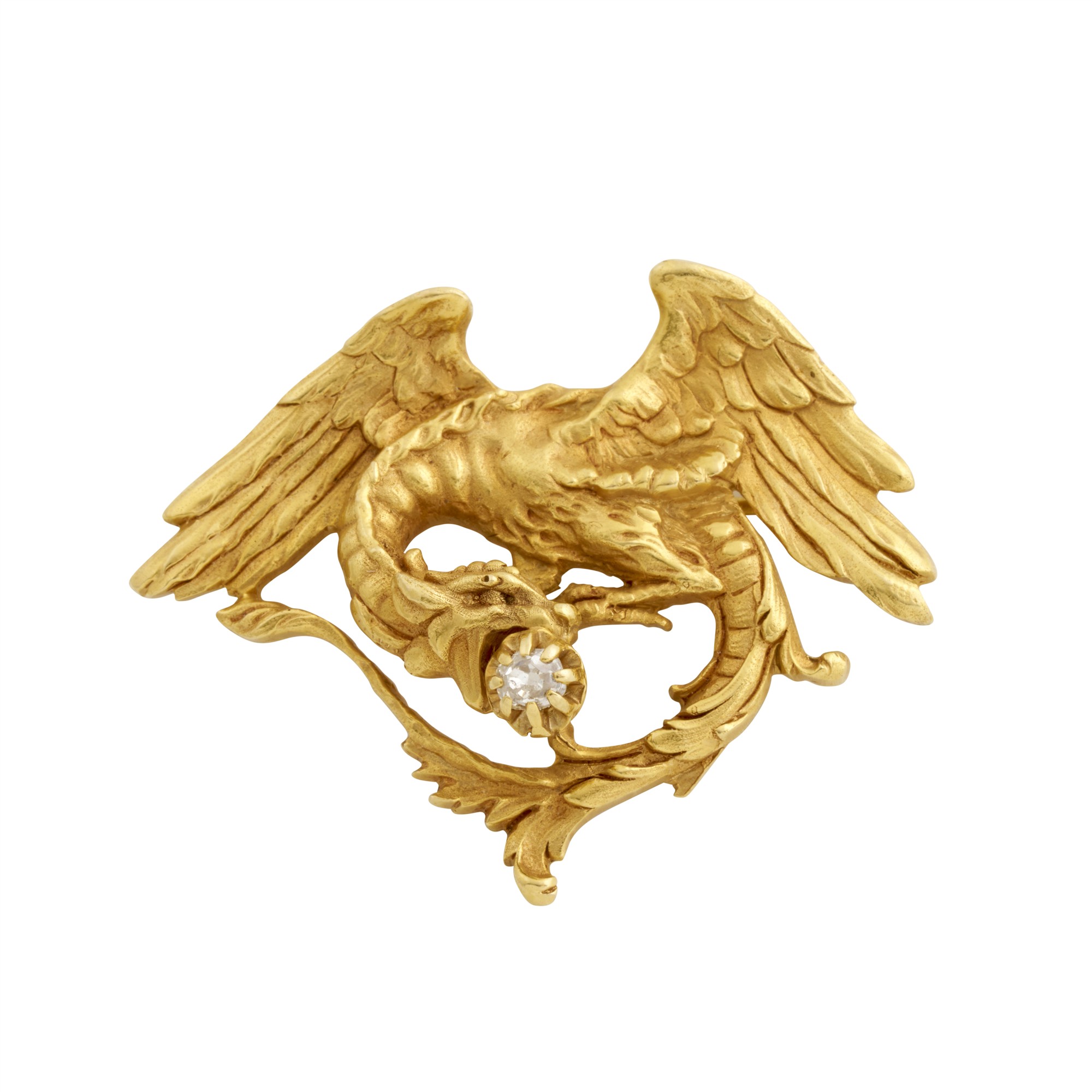19th Century dragon with one claw-set old-cut diamond weighing approximately 0.11 carats, to a pin and pendant attachments, width approximately 45mm, gross weight approximately15.6 grams.