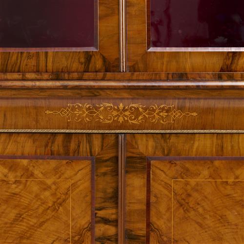 The upper part with a moulded cornice above a pair of glazed doors enclosing adjustable shelves in an interior lined with claret-coloured velvet, the projecting lower part with a pair of panelled cupboard doors, on a bevelled plinth base, both parts with foliate marquetry centres to the friezes and with gilt metal escutcheons and mounts to the pilasters flanking the doors