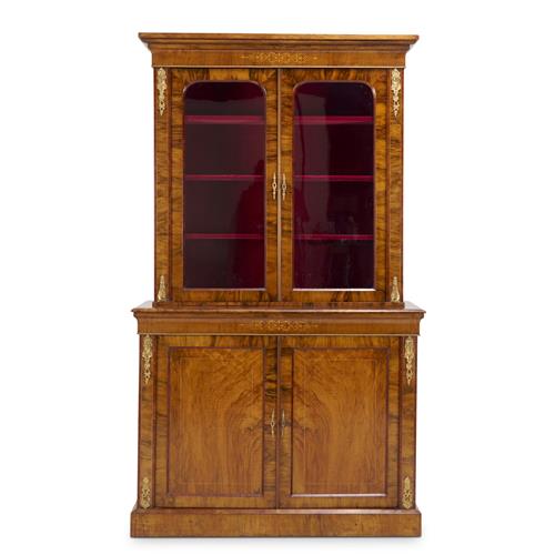 A VICTORIAN GILT METAL-MOUNTED FIGURED WALNUT BOOKCASE CABINET