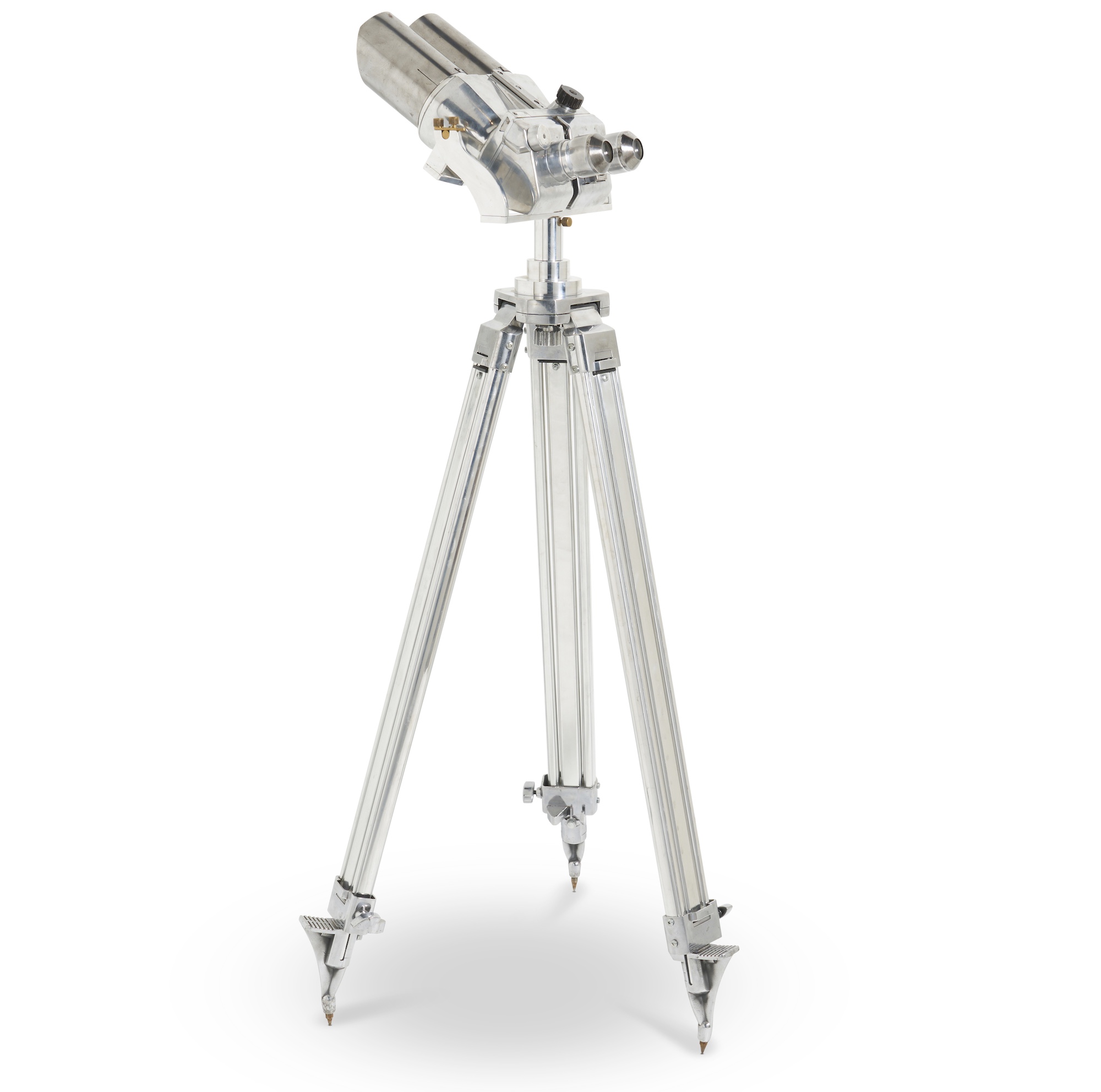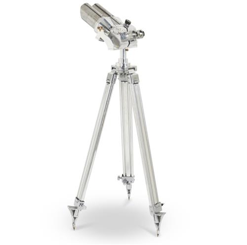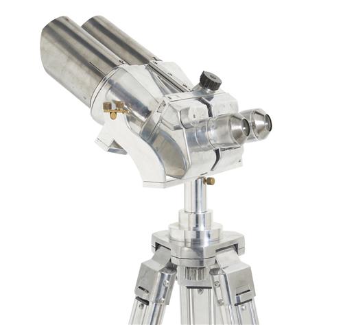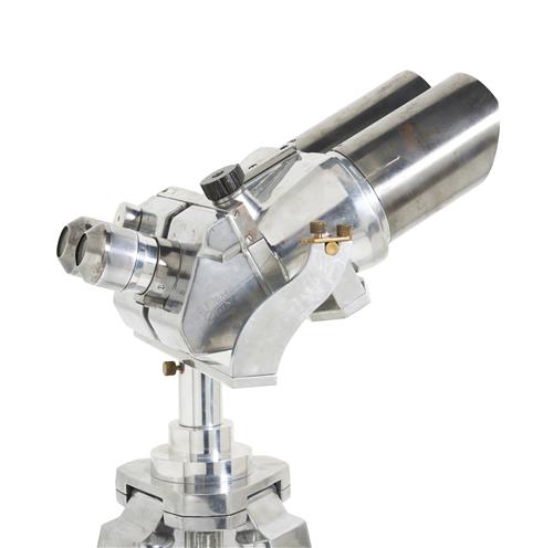 In polished steel, with removable shades, pivoting up and down on a bracket mount, impressed to the right-hand side 'D.F. 10 X 80 / dkl X' ('dkl' being the code for the maker, Josef Schneider) followed by the serial number, with a later extending and folding polished aluminium tripod stand