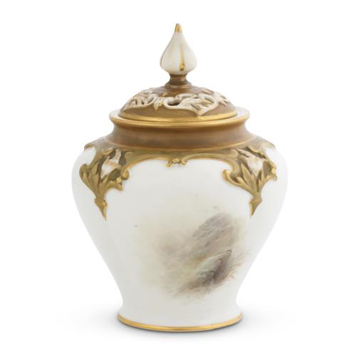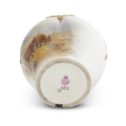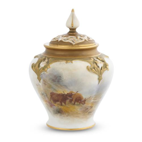 Of lightly lobed compressed baluster shape with a floral-modelled shoulder, decorated to the front with a scene of Highland cattle, signed, the reverse with a subsidiary landscape, the neck and conforming pierced cover gilt and white, printed factory marks underside
