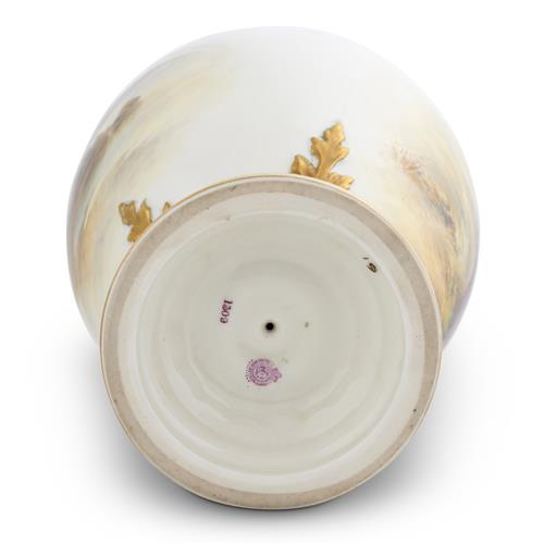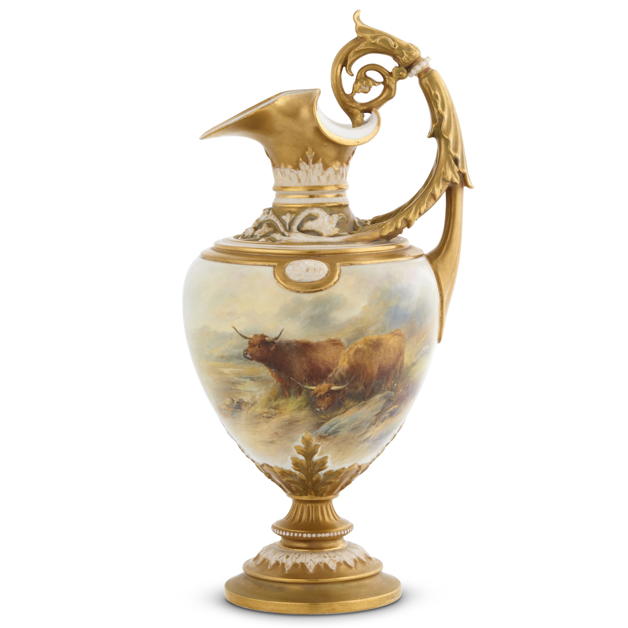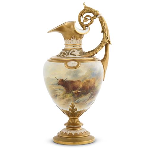 Baluster-shaped with a foliate scrolling handle from the shaped mouth to the moulded shoulder, on a moulded and foliate circular foot, decorated to the front with a scene of Highland cattle, signed, the reverse with a subsidiary landscape, the upper and lower parts gilt and white, printed factory marks underside