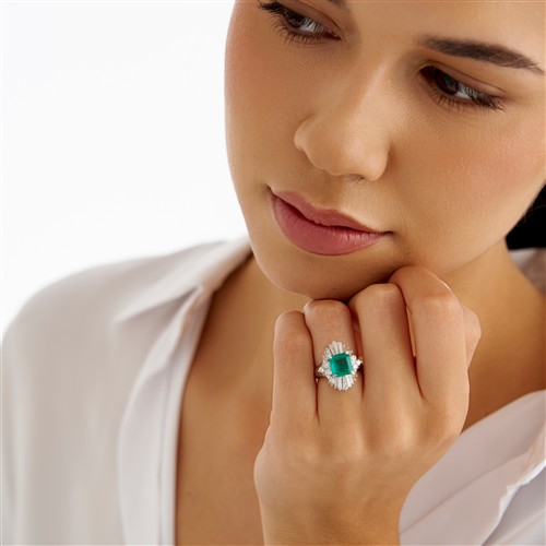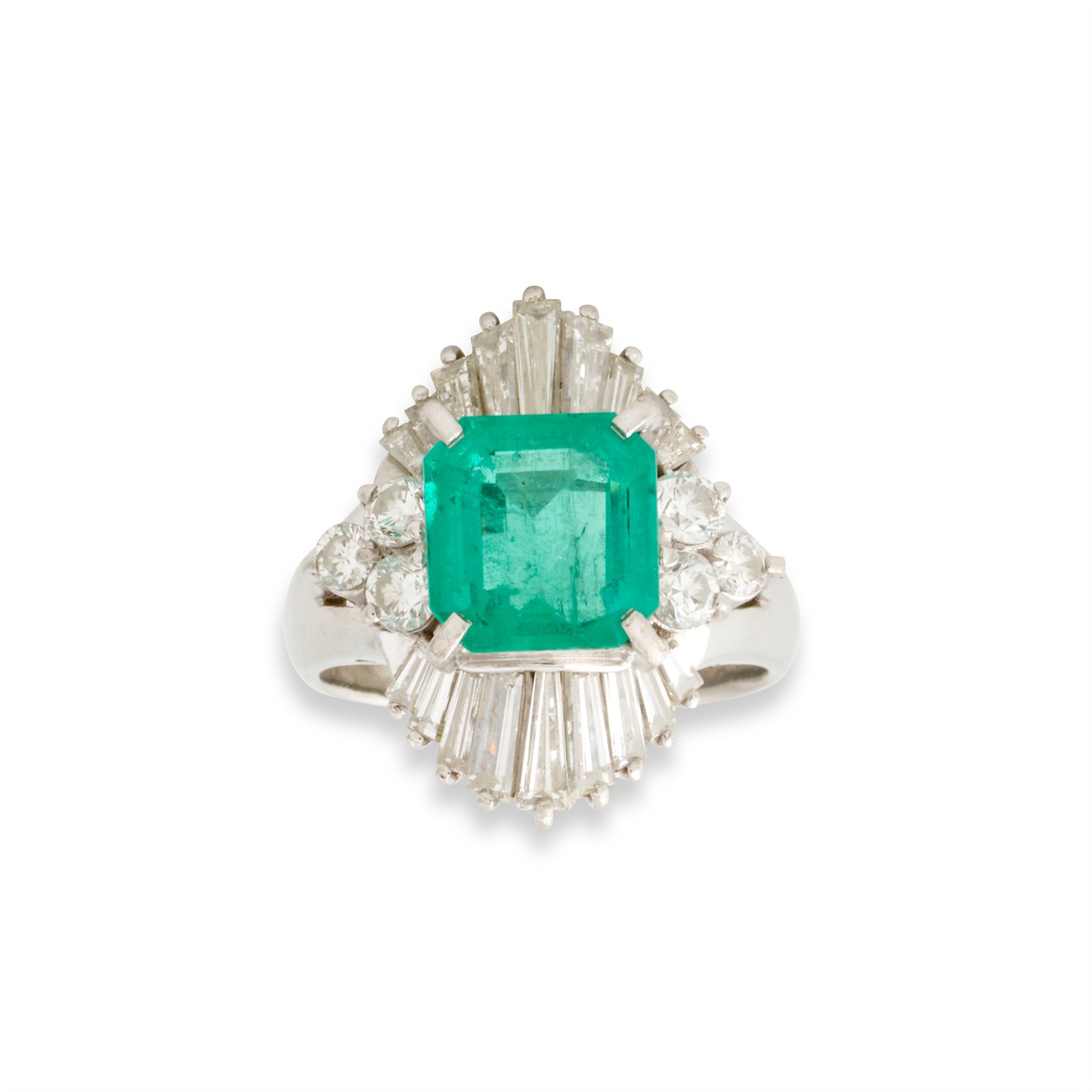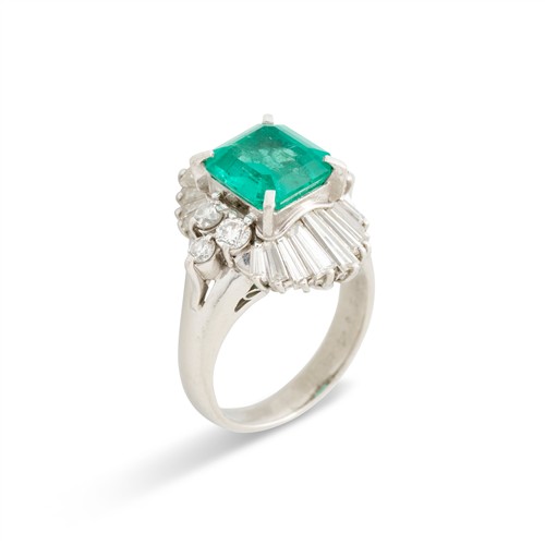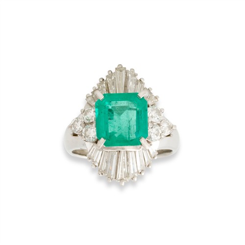 Of cluster design, centring a claw-set octagonal-shaped emerald stated to weigh 2.16 carats, to a surround of claw-set baguette and brilliant-cut diamonds, the diamonds together stated to weigh 1.48 carats, mounted in platinum, size I, gross weight approximately 8.3 grams.
