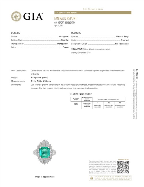 Accompanied by a GIA report (gia.edu/report-check-landing) numbered 2213624794 dated 23 April 2021, stating that the emerald is natural with minor clarity enhancement.