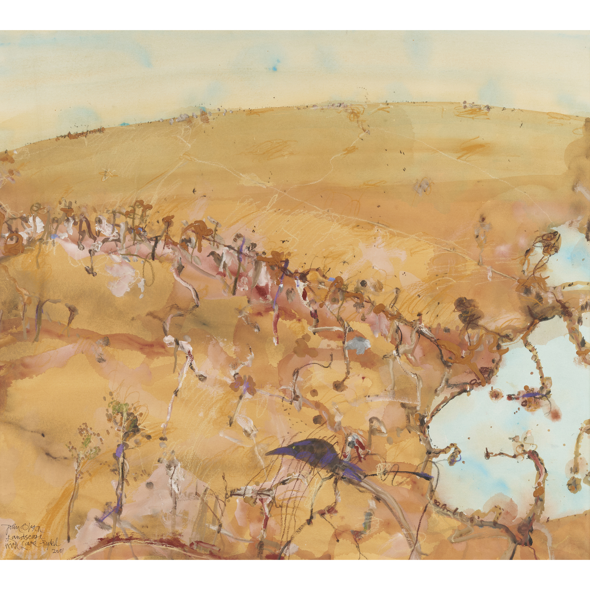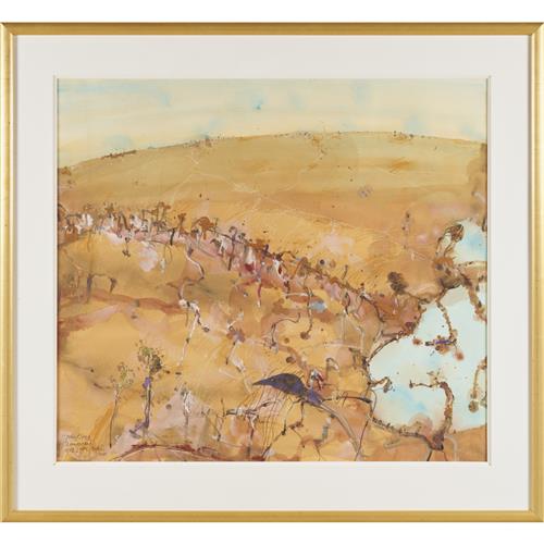 John Olsen's 'Landscape with Lake Rydal' 2001 is an exceptional example of his body of works devoted to the sensory experiences and metaphysical presence of the Australian landscape. Executed in watercolour and mixed media, the work radiates with Olsen's signature interplay of expressive line, colour, and the visceral rhythms of nature. Across his seventy-plus year career, Olsen generated a visual language that uniquely captured the Australian landscape.