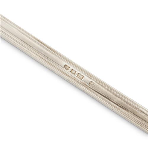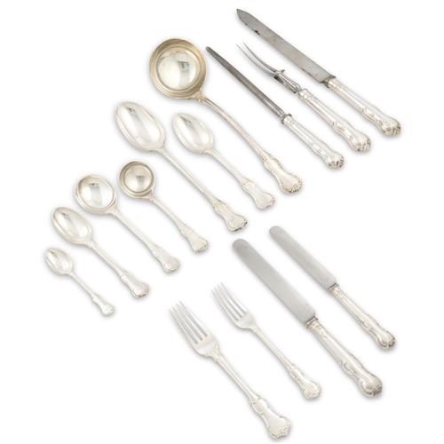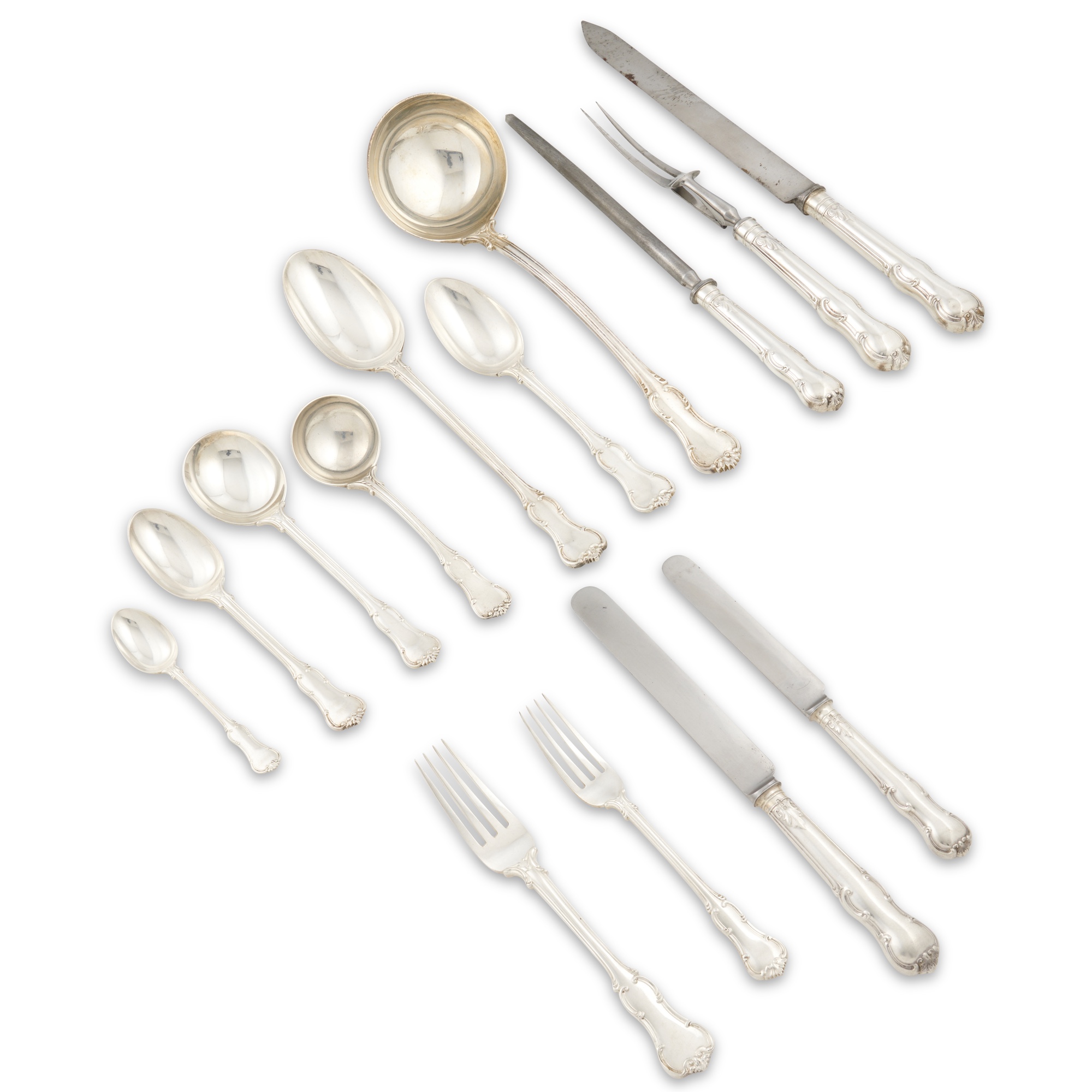 Of King's shape close to Chawner's 'Princess No. 1' pattern, a service for twelve, ninety-one pieces, comprising twelve each of entrée knives and forks, table knives and forks, soup spoons, dessert spoons, and tea spoons, together with nine various serving pieces including a carving set, serving spoon, and ladles, all fitted in the original oak canteen of three drawers