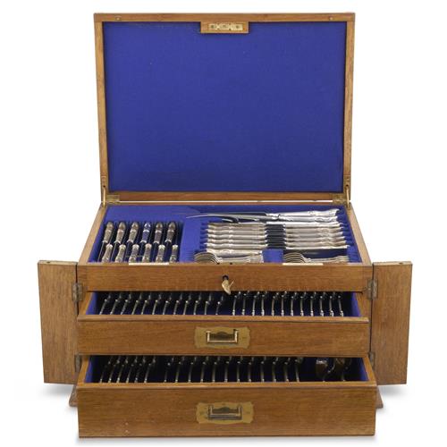 A GEORGE V STERLING SILVER FLATWARE SERVICE, IN OAK CANTEEN
