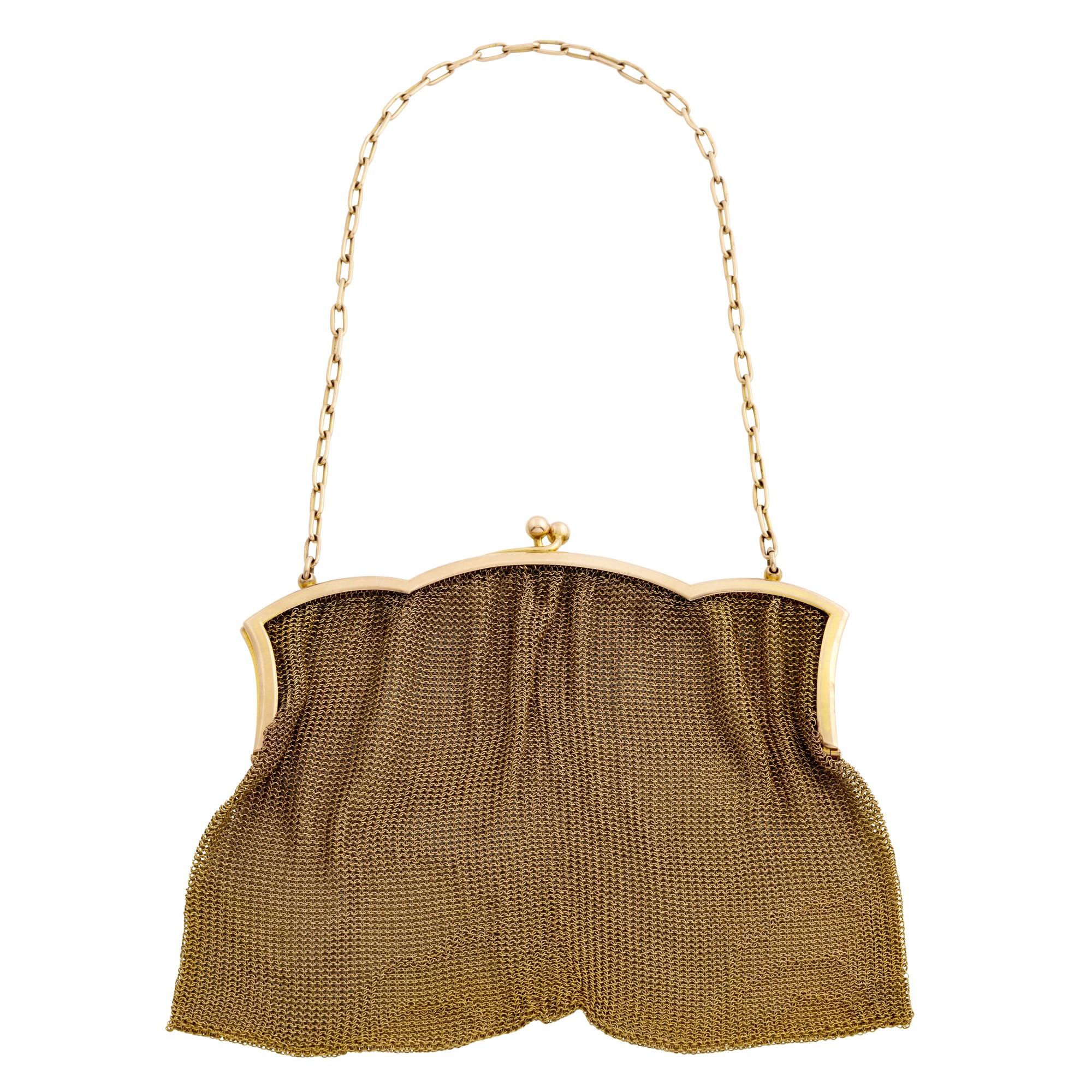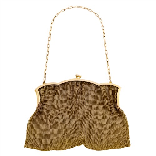 Styled in mesh link, to a structured top and elongated 7ct gold link chain handle, length 140mm, width 150mm, gross weight approximately 150 grams.