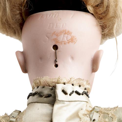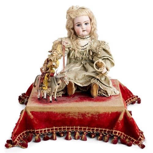 The bisque-head girl with blue glass eyes, blonde mohair wig, carton torso and legs with metal hip hinge, wire upper arms, bisque forearms, arranged aside the doll is a paper mache donkey with nodding head upon which is seated a papier-mâché Polichinelle in original classic costume; and she holds a ribbon with bells in her left hand and a bone rattle in her right hands, all upon a velvet-covered plinth, when wound there are a number of synchronic movements: turning head side to side, blinking eyes, leaning forward, alternately waving arms, kicking feet up and down in delight, while the donkey nods his head and swings back and forth
