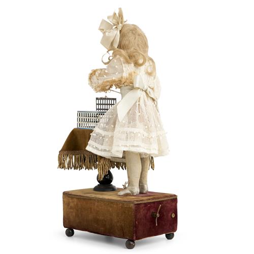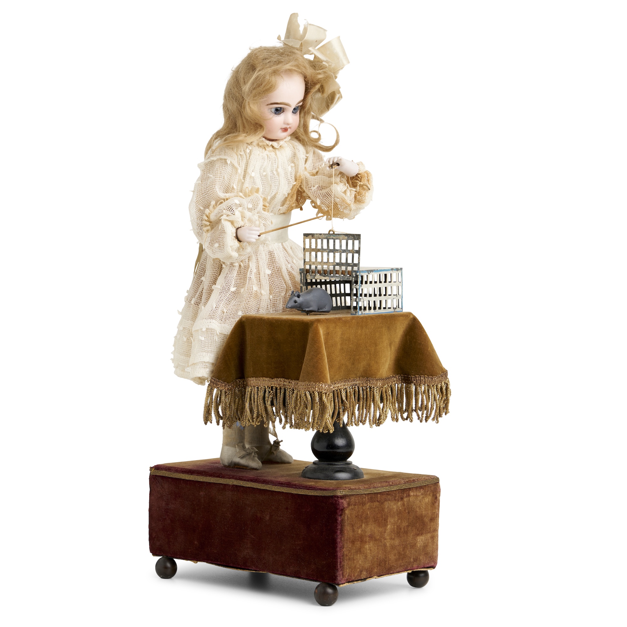 Standing behind a velvet-covered table with a painted tin mouse cage is a bisque-head doll with blue glass paperweight eyes, brunette mohair wig, carton torso and legs, bisque forearms, holding a baton in one hand and the string to open the mouse cage in the other, standing upon a velvet-covered plinth raised on four ball feet, when wound, two mechanisms operate in synchronism: the girl lifts her head and then lifts her left arm to open the door of the cage, allowing the mouse to timidly emerge and then whirl around as though to scurry back into the cage, music plays throughout