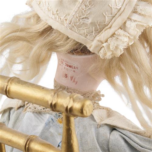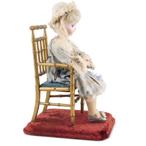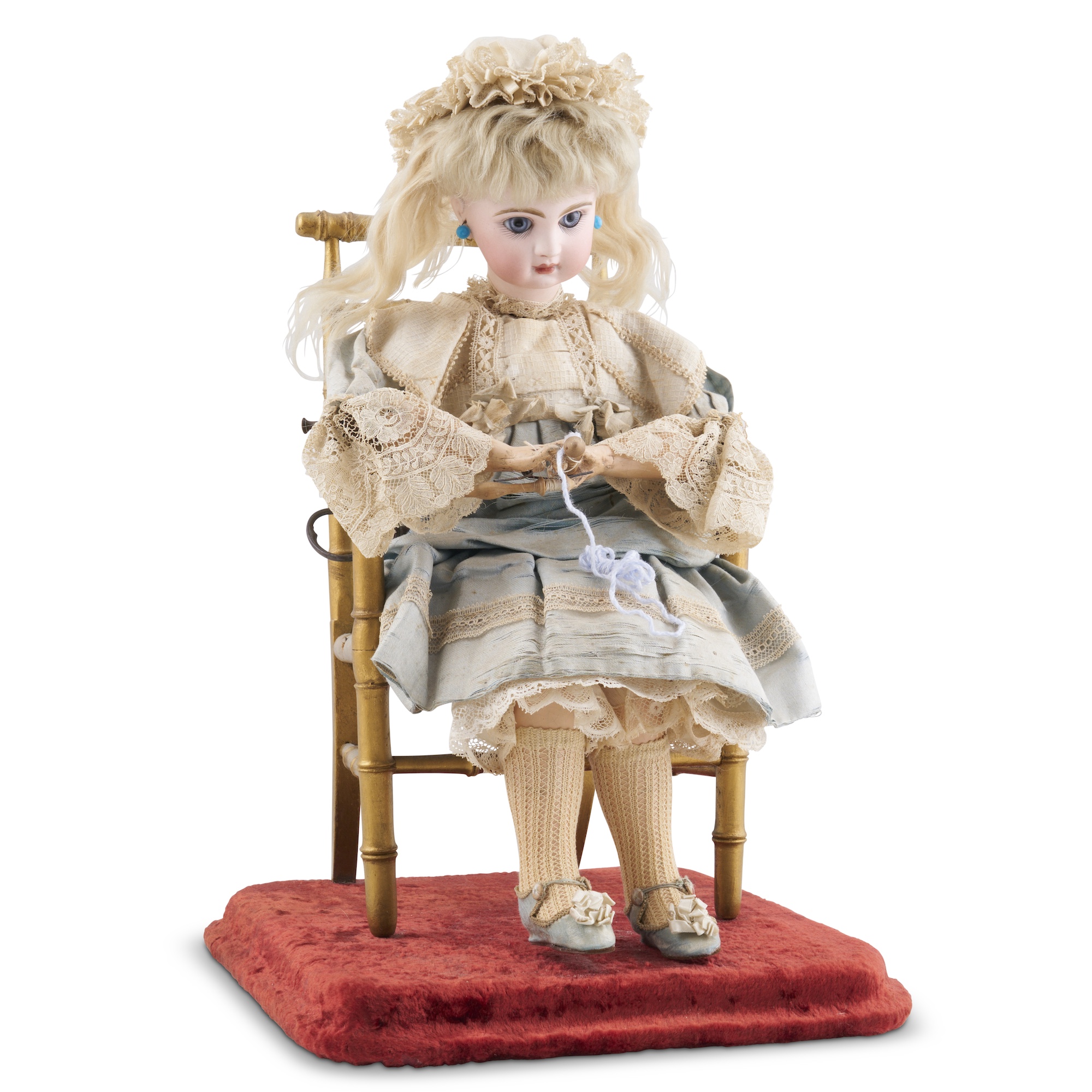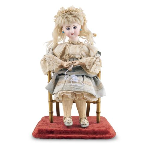 The doll modelled seated on a gilt-wood arm chair, on a stepped velvet covered base, with a bisque-head, very deep blue glass paperweight inset eyes, blonde mohair wig over cork pate, carton torso and lower arms and legs, wire upper arms and legs, with original silk and lace costume, with wooden bobbins in her hands, when wound, music plays, her head moves up and down as though watching herself knitting, and her hands flit to and fro, realistically, as though knitting