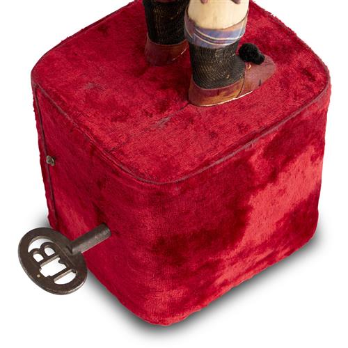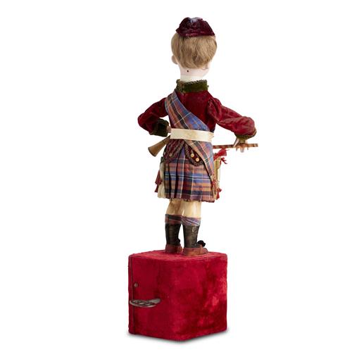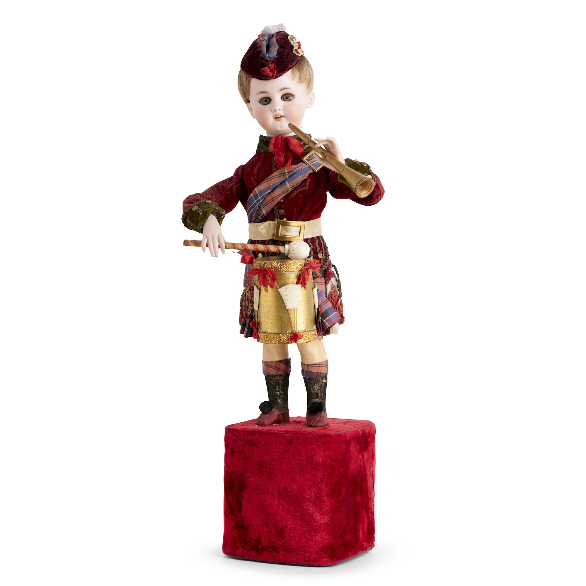 The bisque-head doll with blue glass eyes, brunette mohair wig, carton torso and legs, wire upper arms, bisque lower arms, wearing velvet and silk Scottish costume and tam, and holding wooden horn and baton in his hands; a drum is attached to metal rods from torso, standing upon a red velvet-covered plinth, when wound, the doll turns its head side to side and nods, eyes blink, brings the horn up as though to play, and beats drum, while music plays, with original tune label on bottom listing two tunes