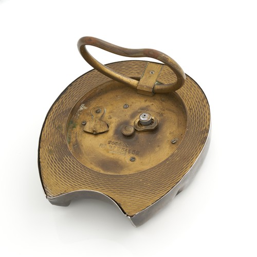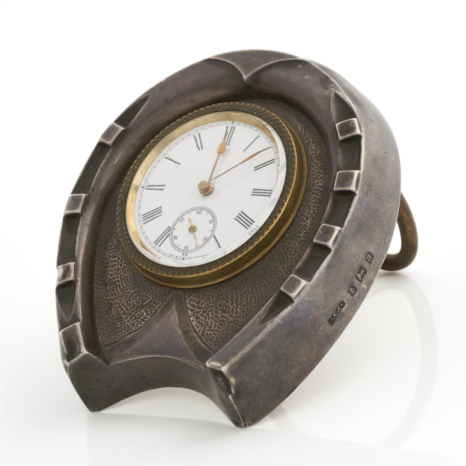 AN EDWARDIAN HORSESHOE DESK CLOCK, SWISS MOVEMENT, OUTER WITH BIRMINGHAM HALLMARKS, CIRCA 1900, 90MM X 80MM