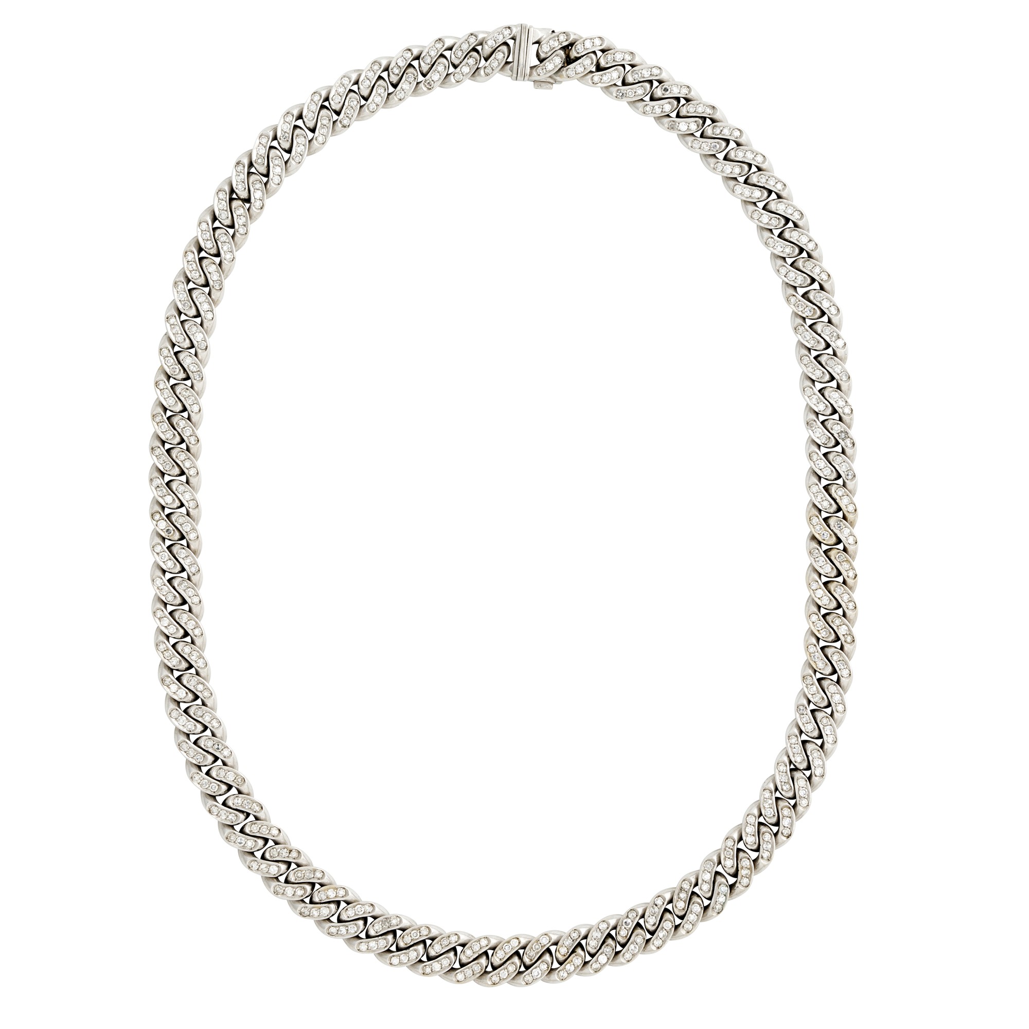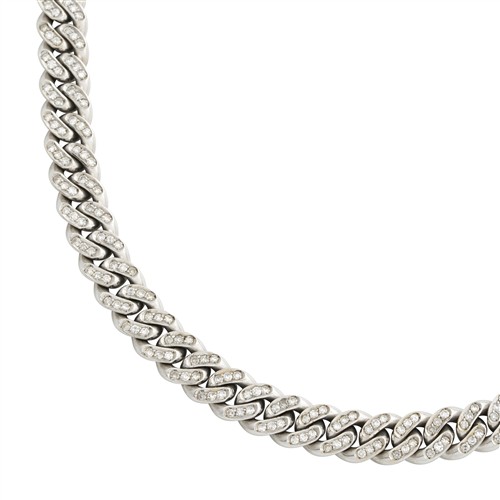 Modelled as a heavy cuban link claw-set with round brilliant-cut diamonds, completed by a concealed box clasp, length 380mm, gross weight approximately 71.4 grams.
