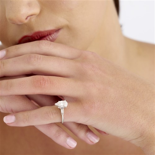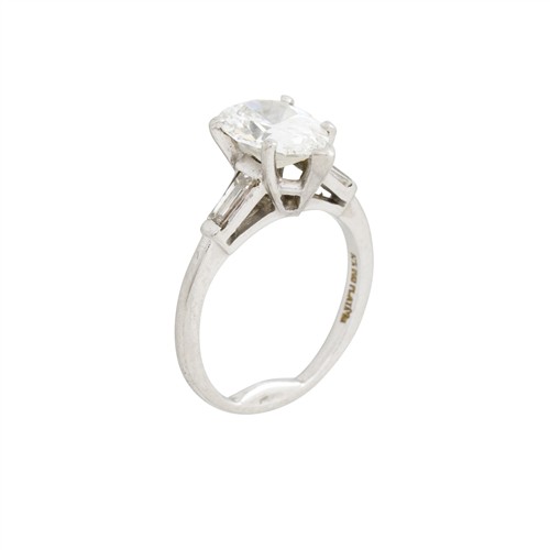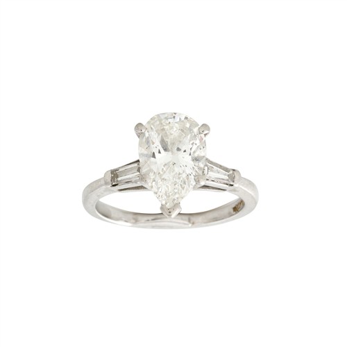 Centring a claw-set pear-cut diamond with two tapered baguettes set to the shoulders on a rounded band, the diamonds together weighing approximately 2.52 carats, size K, gross weight approximately 4.6 grams.