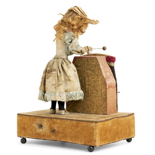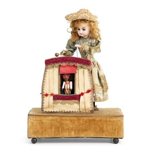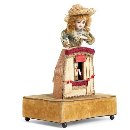 Modelled as a young girl wearing silk dress and woven bonnet, standing behind a toy theatre with silk and velvet curtains, the girl with bisque head, blue glass paperweight inset eyes, auburn mohair wig, cork pate, carton torso and legs, wire upper arms, bisque forearms, all above a velvet covered plinth on four bun feet, when wound she taps the roof of the theatre and the curtain lifts revealing the little puppet who waves his arms, this repeats but when the curtain raises again the head of the puppet changes (three heads in total), music plays throughout
