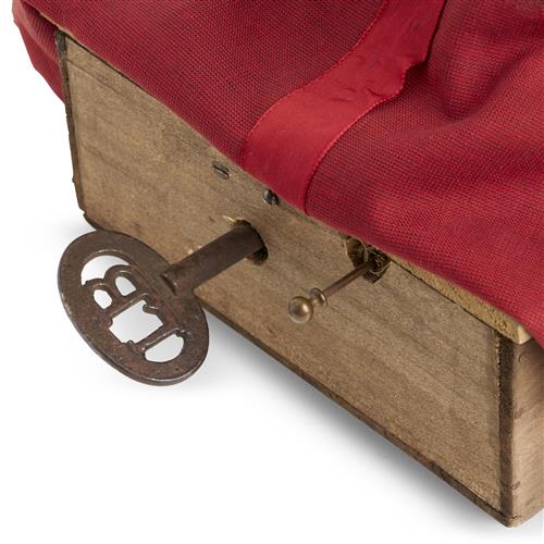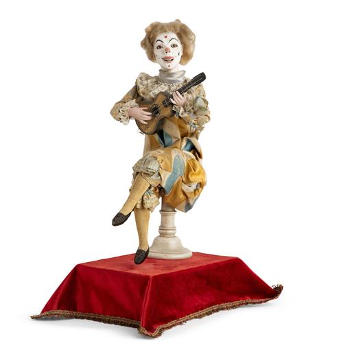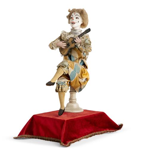 Modelled as a clown seated cross-legged on a wooden stool dressed in a colourful silk and lace costume holding a guitar, with a paper mache head with painted white complexion, red tipped nose and clown decorations, brown glass eyes, blonde mohair wig, carton torso and legs, metal hinge at hips, bisque hands, when wound, the clown turns his head side to side, nods, eyelids open and close and tongue sticks in and out, while he strums the guitar with his right hand, and taps his right leg in time to the music which plays