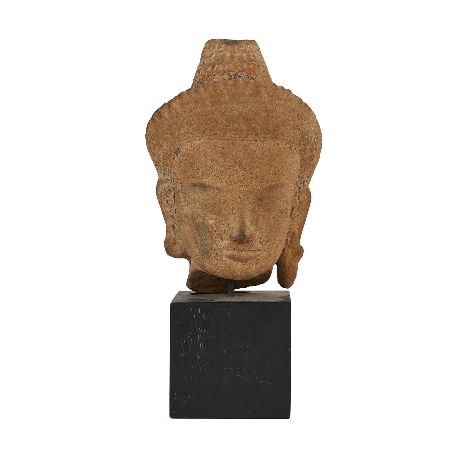 12th-13th century, with conical headdress and diadem, elongated earlobes, on wooden base.