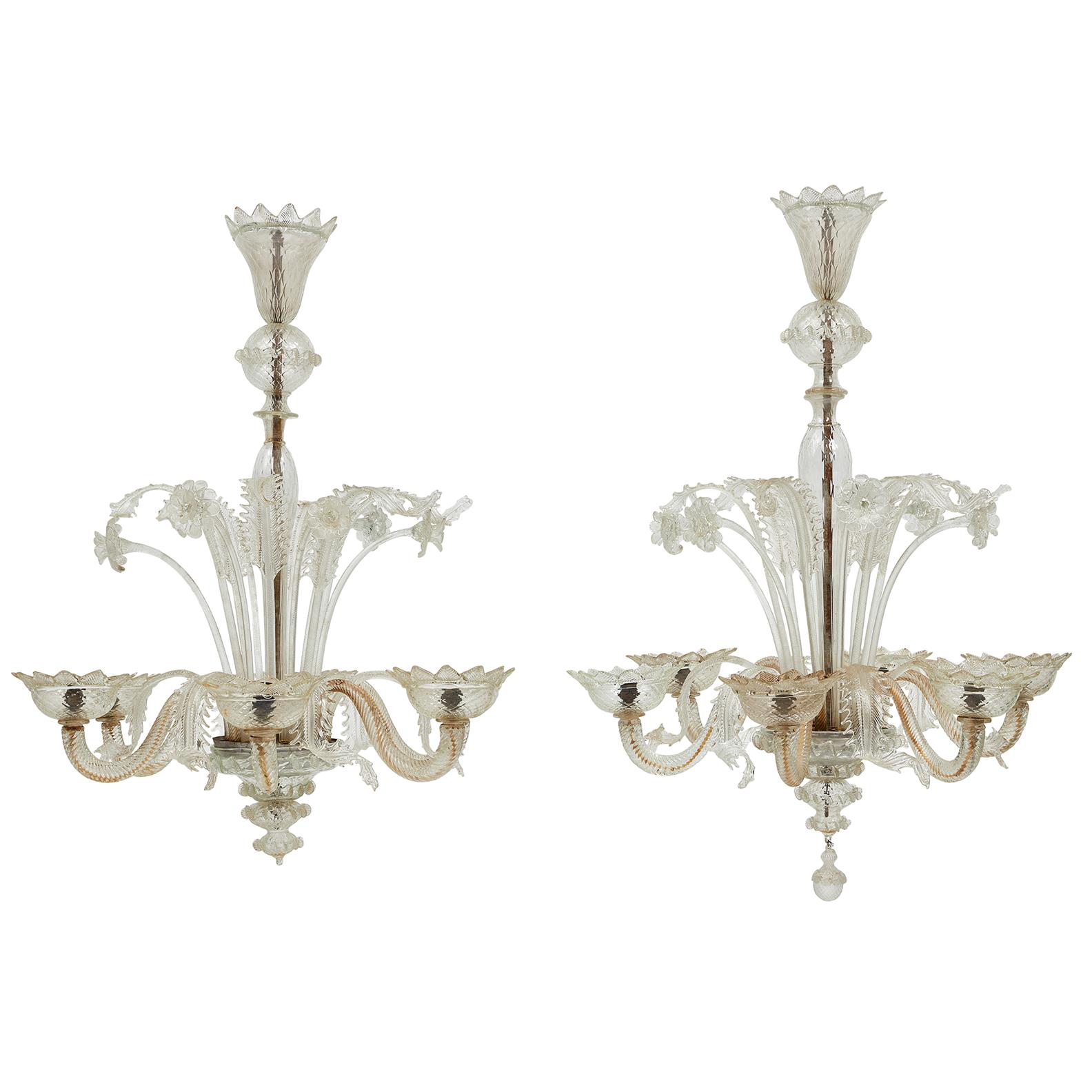 One chandelier lacking lower pendant, one shade broken and repaired, several foliate branches with losses to ends (two retained), discolouration to wiring and rust to metal.