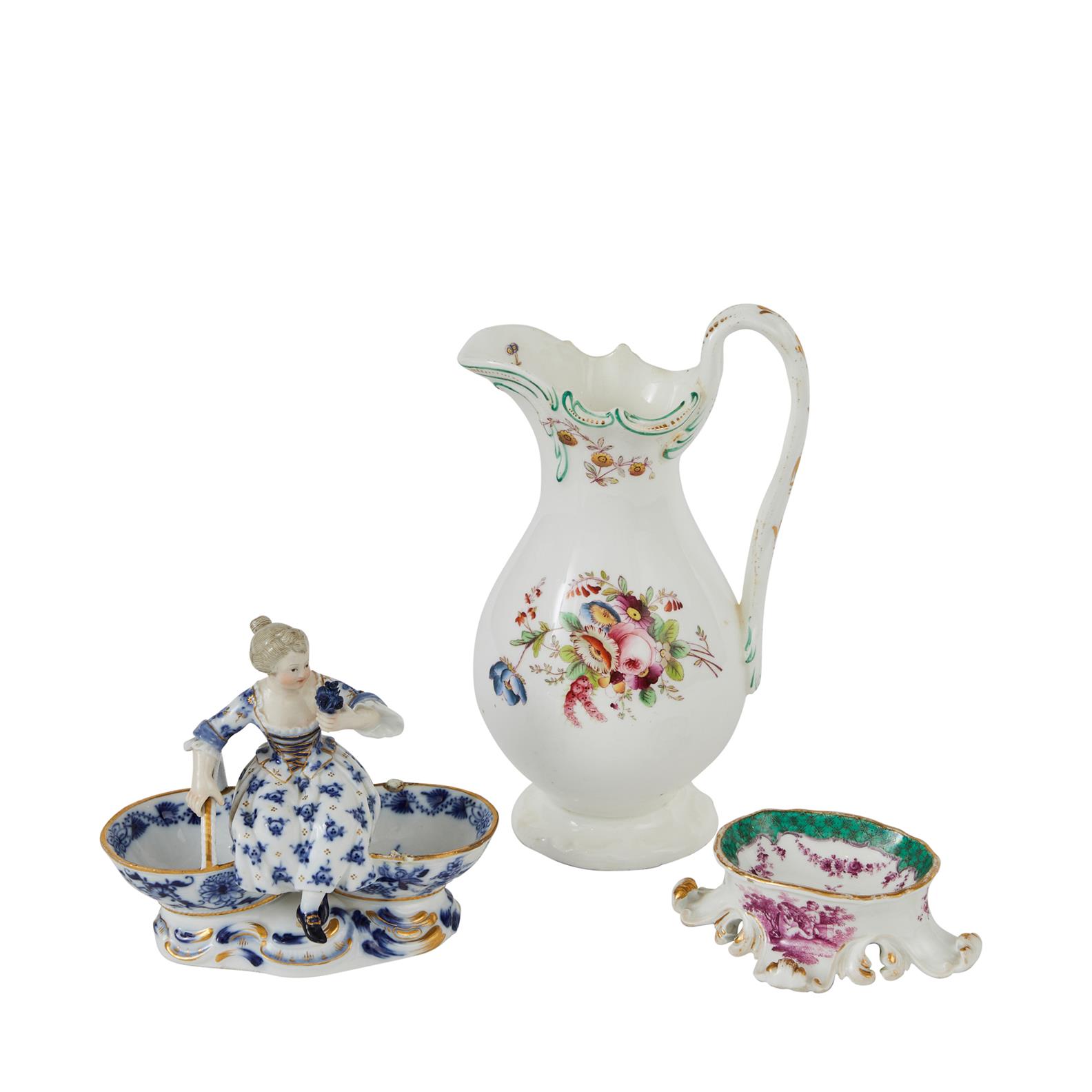 A MEISSEN MARCOLINI PORCELAIN SALT, A MEISSEN PORCELAIN DOUBLE SWEET-MEAT DISH AND AN ENGLISH PORCELAIN CREAM JUG