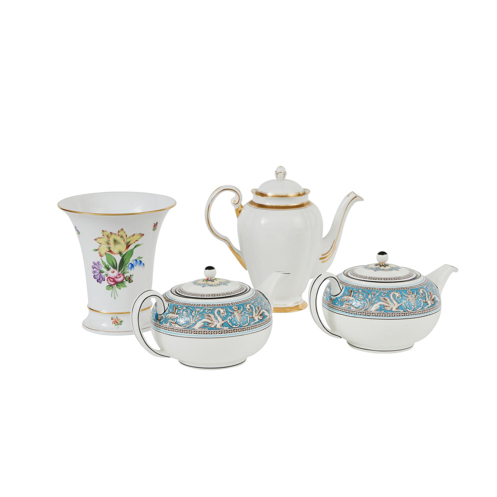 A PAIR OF WEDGWOOD FLORENTINE TURQUOISE PORCELAIN TEAPOTS, A HEREND PORCELAIN VASE AND AN ENGLISH PORCELAIN COFFEE POT