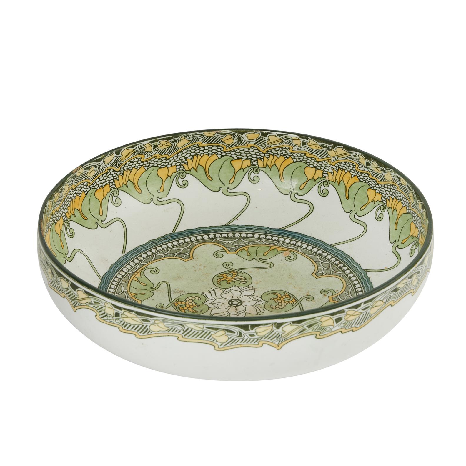Transfer decorated in art nouveau designs in greens and yellows.