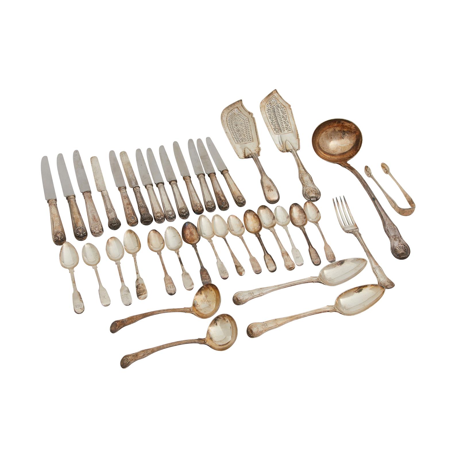 Mixed makers and dates, mainly 19th century including eight small and three large fiddle thread and shell knives, two fish slices, a king's pattern soup ladle and two sauce ladles, fourteen various tea spoons and others.