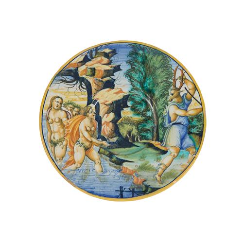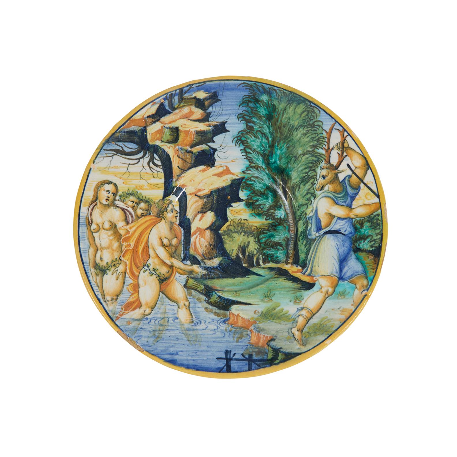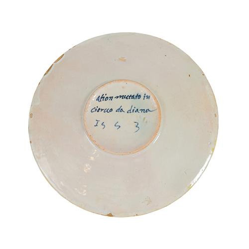 Painted in colours with Diana and Actaeon, with inscription "Ation mectato in ciercco da diana 1553".