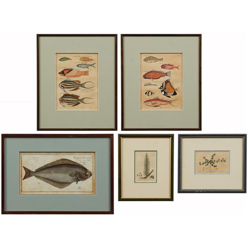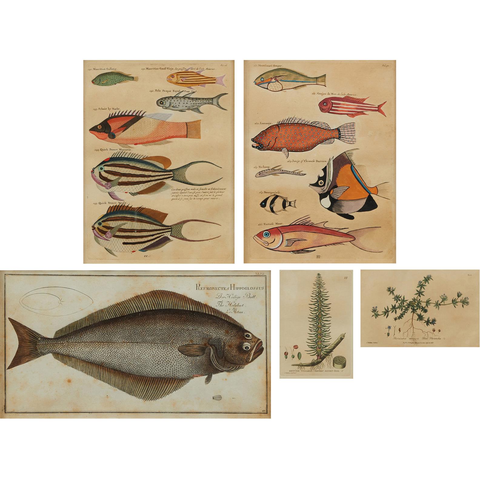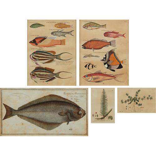 Comprising: a halibut after Bloch, two prints from the series 'the Fishes of the Indo-West Pacific' after Samuel Fallours, and two botanical engravings after C. Mathews.
