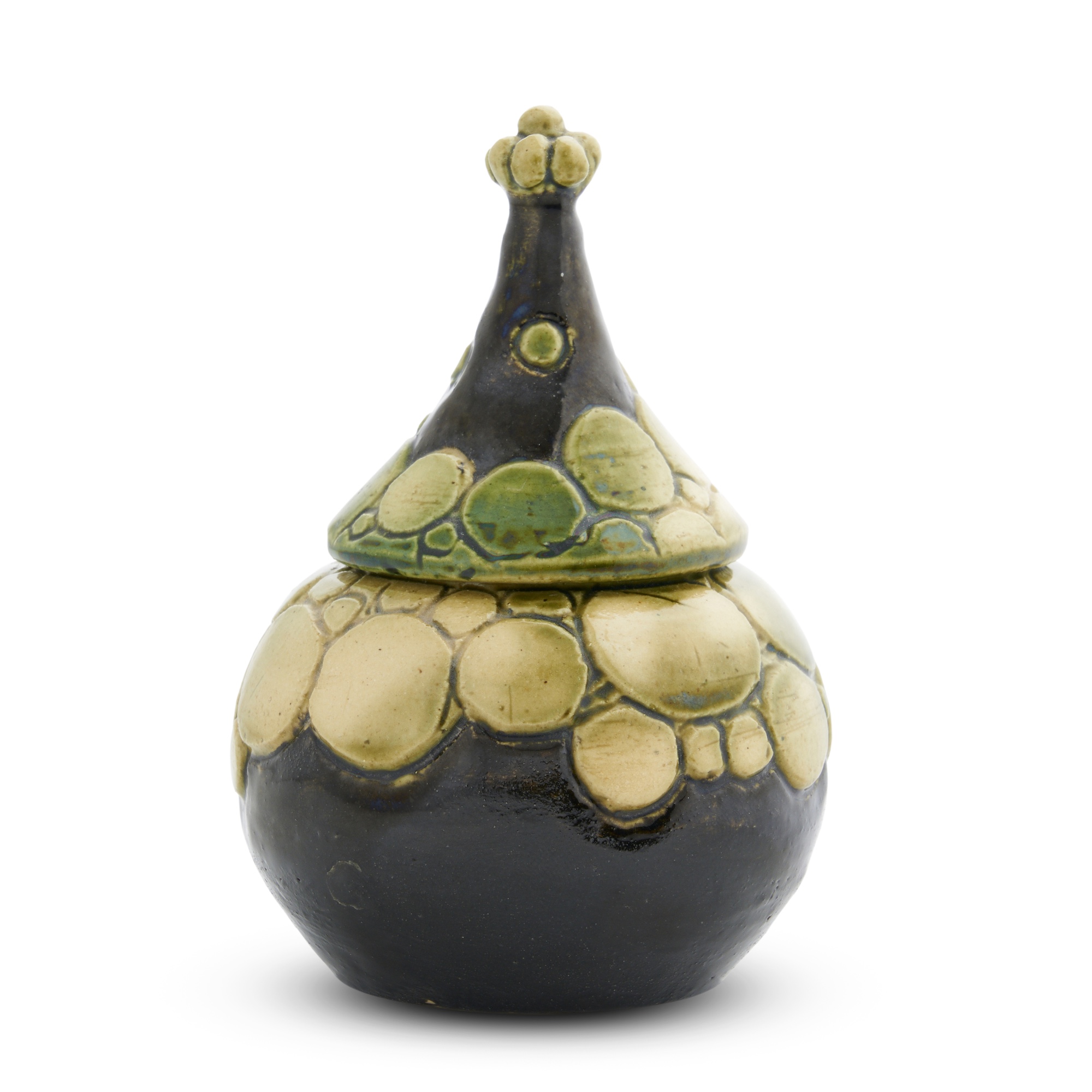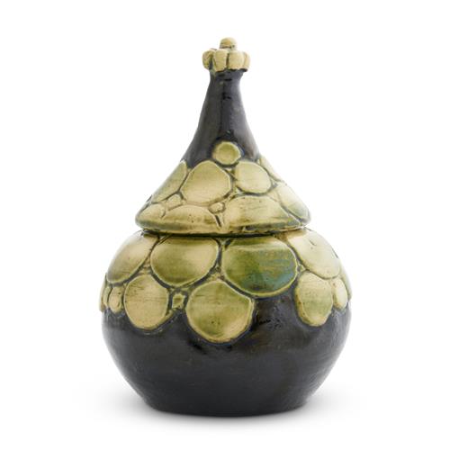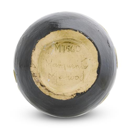Globular with a tall cover rising to a narrow point with a shaped finial, the body and cover incised with a design of overlapping circles of various size, variously glazed in black and greens, incised signature 'Marguerite Mahood' and numbered 'M1560' underside