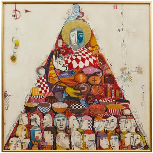 This was the artist's Blake Prize Entry in 1964 (label verso). Upon exhibition in the Blake Prize, John Henshaw of the Bulletin commented: "Ken Reinhard's pop pyramid of decorative trivialities underlines the fact that materialism can't present any other appearance than what it is."