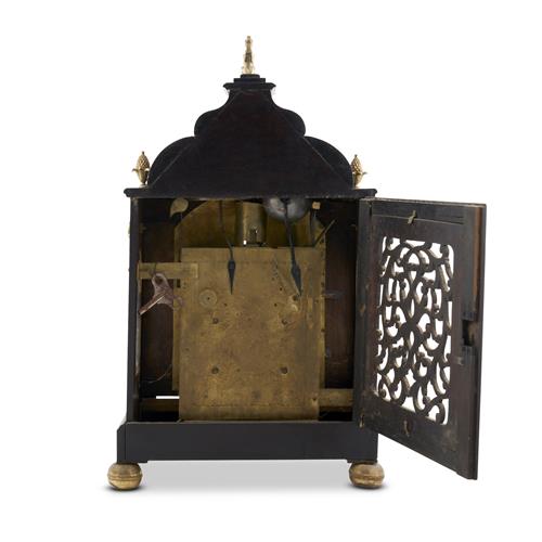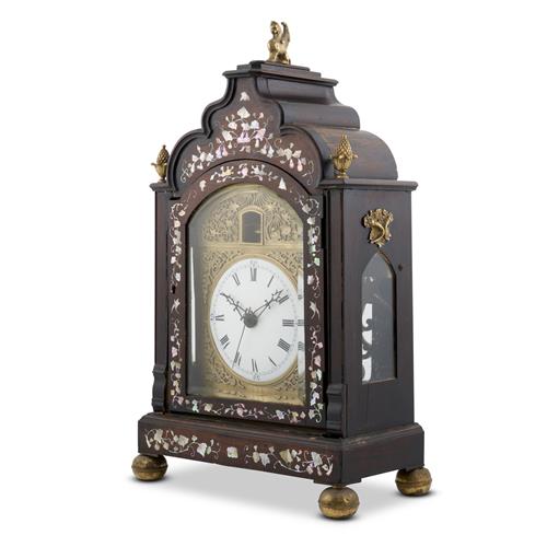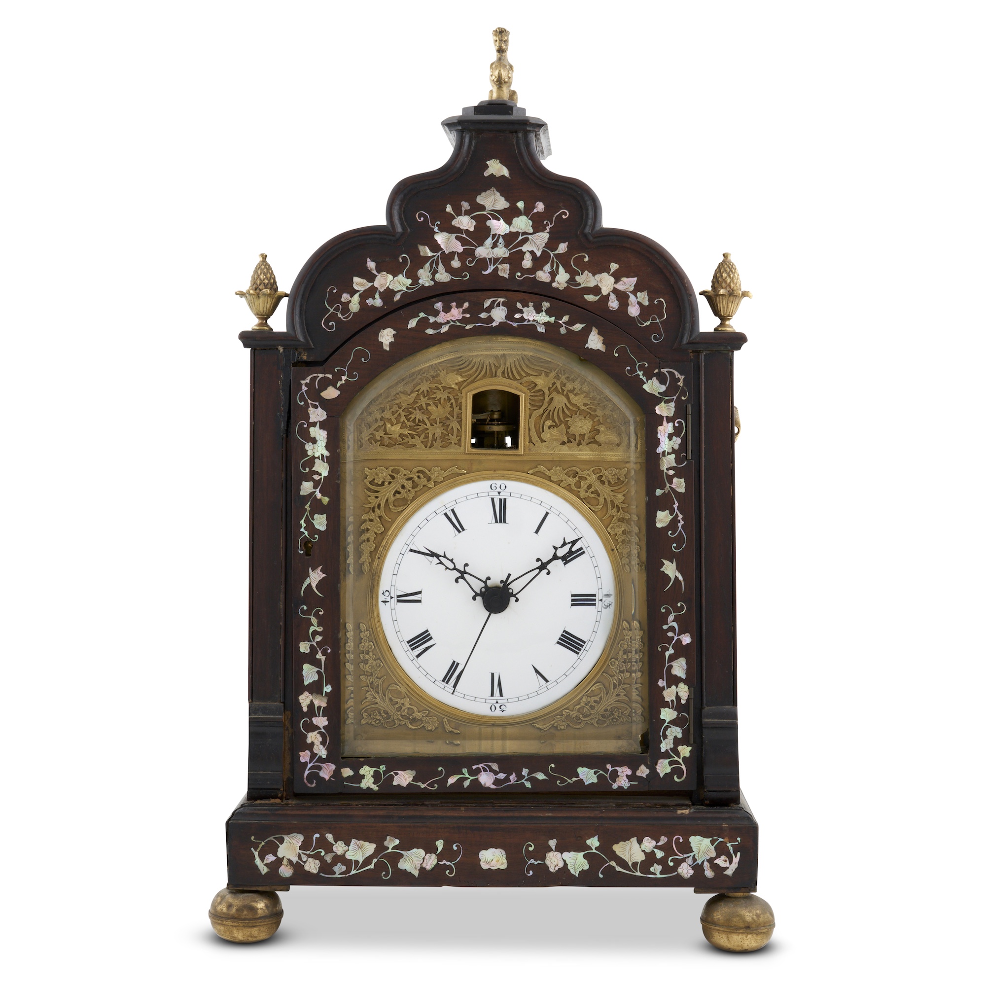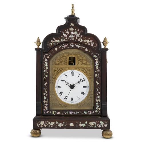 The double fusee two-train movement with duplex platform escapement quarter-striking on eight bells, the black and white-japanned Roman numeral dial within applied gilt relief spandrels in Chinese manner in an upright case with shaped top above a glazed door to the front, glazed sides, and a fretwork door to the back enclosing the decoratively engraved brass backplate, the front of the case inlaid with nacre in trailing foliate designs, with brass finials and ball feet