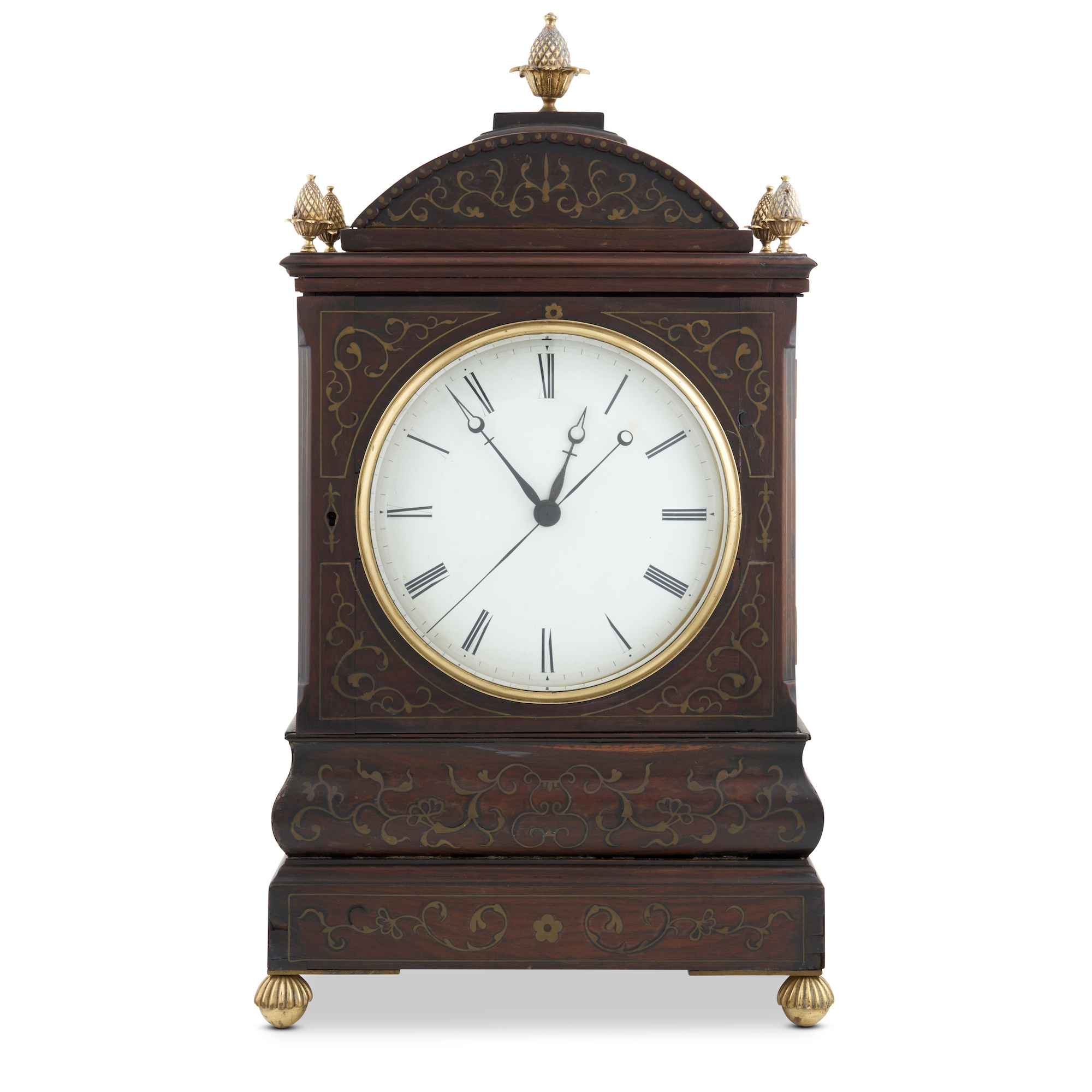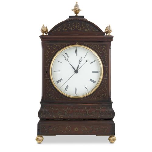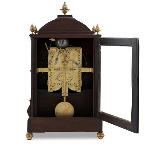 The double fusee movement with anchor escapement striking on eight bells, the black and white-japanned Roman numeral dial within a glazed brass bezel in an upright case of architectural design with brass grilles to the sides and a glazed door to the back enclosing the signed brass backplate, the front of the case inlaid with brass in trailing foliate designs, with brass finials and feet