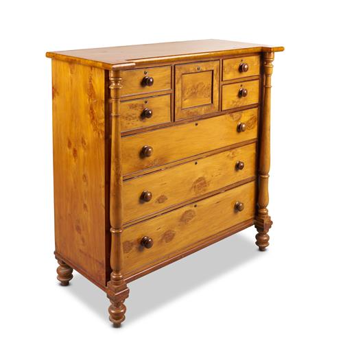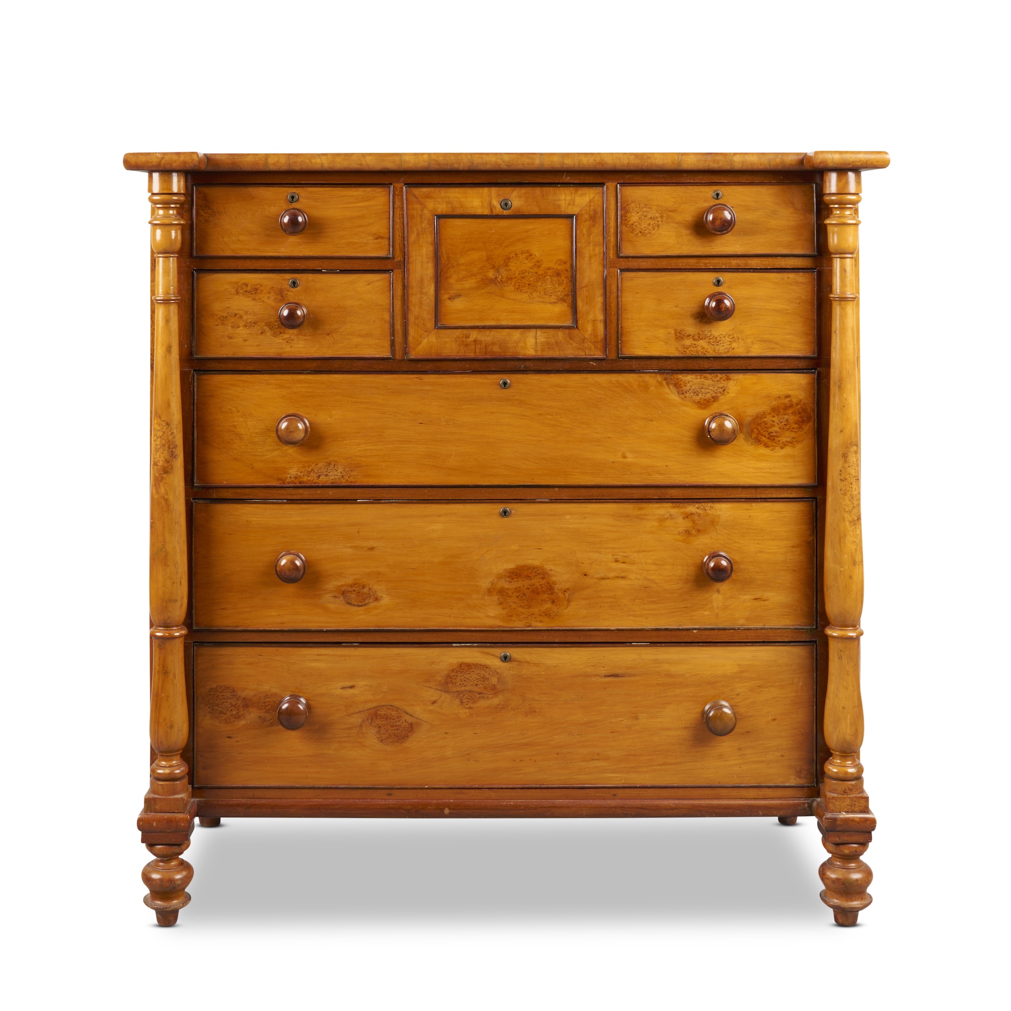 Rectangular, the inverted break-front top above an arrangement of five short drawers and three long drawers between turned columns, on turned feet, the top, drawer fronts, and sides all in sold Huon pine (the top with a cedar substrate), all with clusters of burr figuring, the drawer linings and the backboards of Australian cedar, the drawers retaining apparently original pulls and Bramah type locks