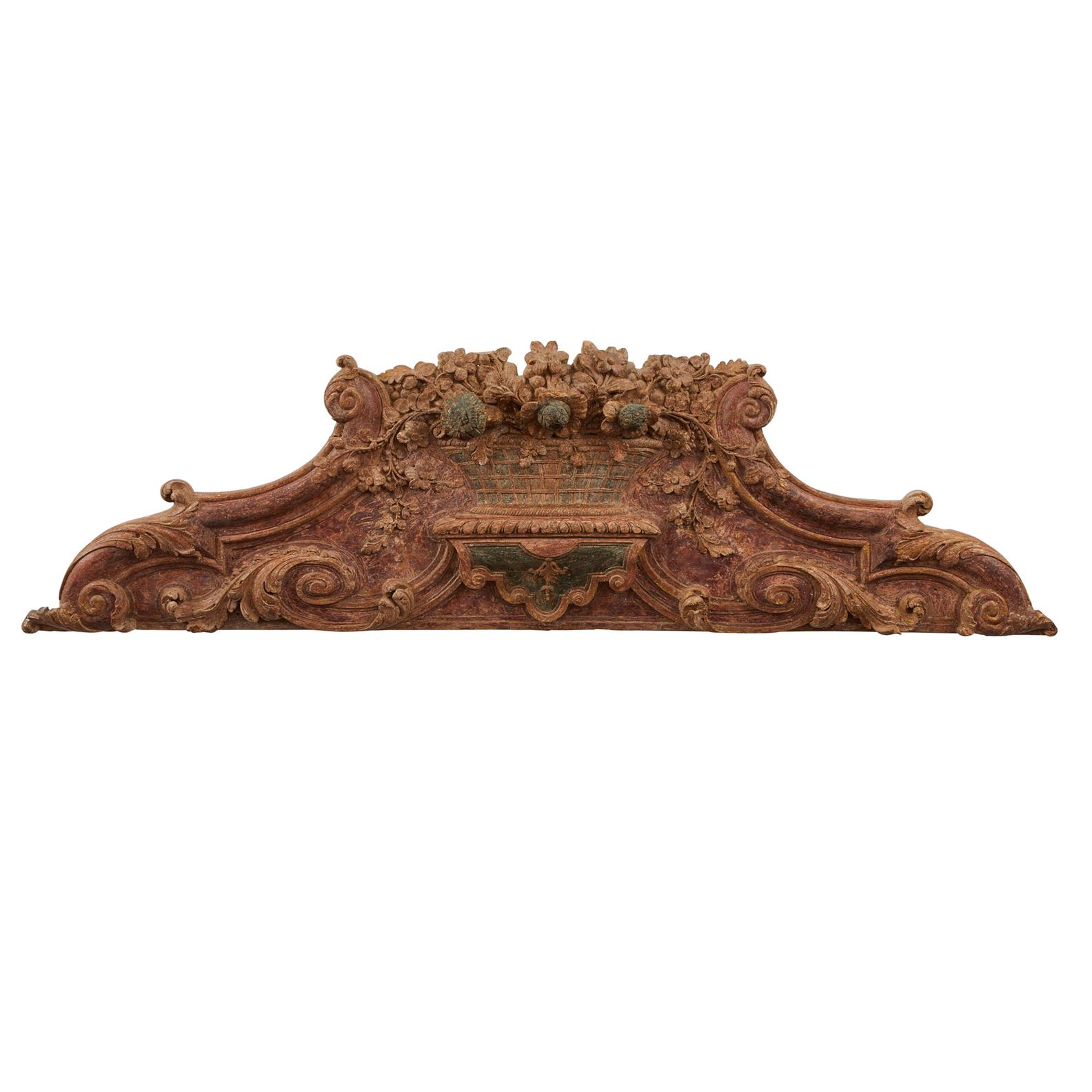 Circa 1730, centred with a basket of flowers on a labrequin flanked by foliate scrolls, retaining traces of original paintwork.