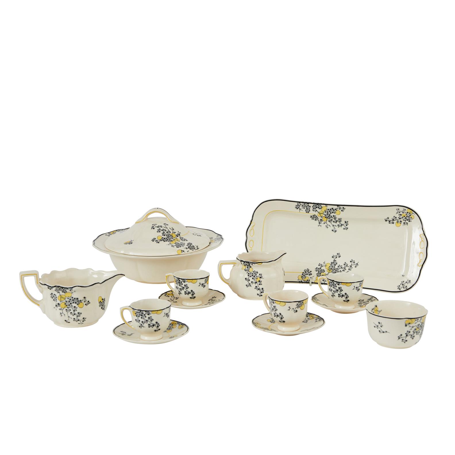 Circa 1930, decorated with a stylised prunus blossom design, comprising four cups and saucers, a rectangular sandwich plate, a muffin dish, two jugs and a sugar basin.