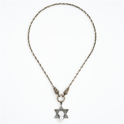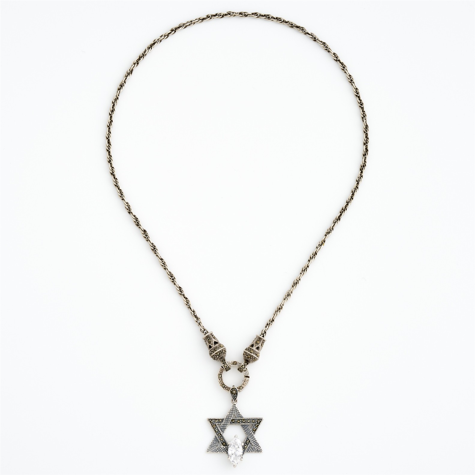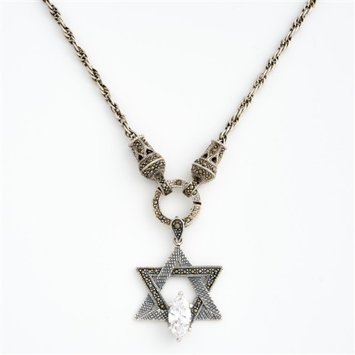 A STAR OF DAVID NECKLACE IN STERLING SILVER, WITH CUBIC ZIRCONIA AND MARCASITE STUDS, TOTAL LENGTH 46MM