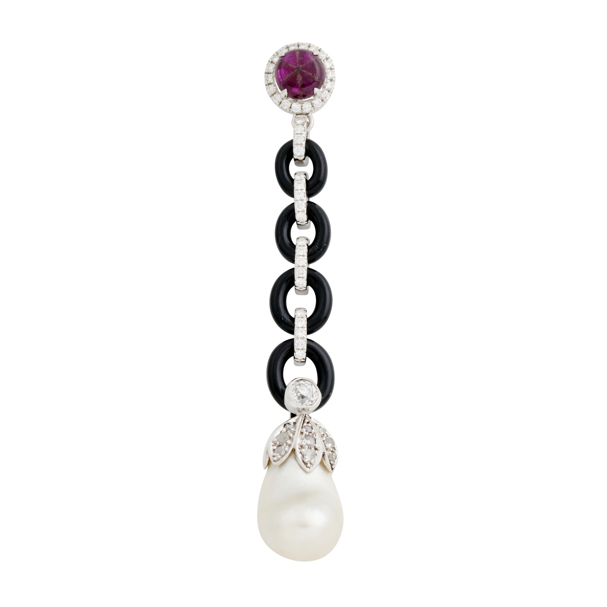 Centring a trapiche ruby cut en-cabochon, set in four claws within a halo of claw-set round brillant-cut diamonds articulated with a graduating drop of alternating claw-set diamond and black enamel links further suspended above a bezel-set round brilliant-cut diamond with millegrain edging and a white baroque pearl drop with a diamond encrusted cap to a hidden bale, length approximately 62mm, gross weight approximately 5.5 grams.