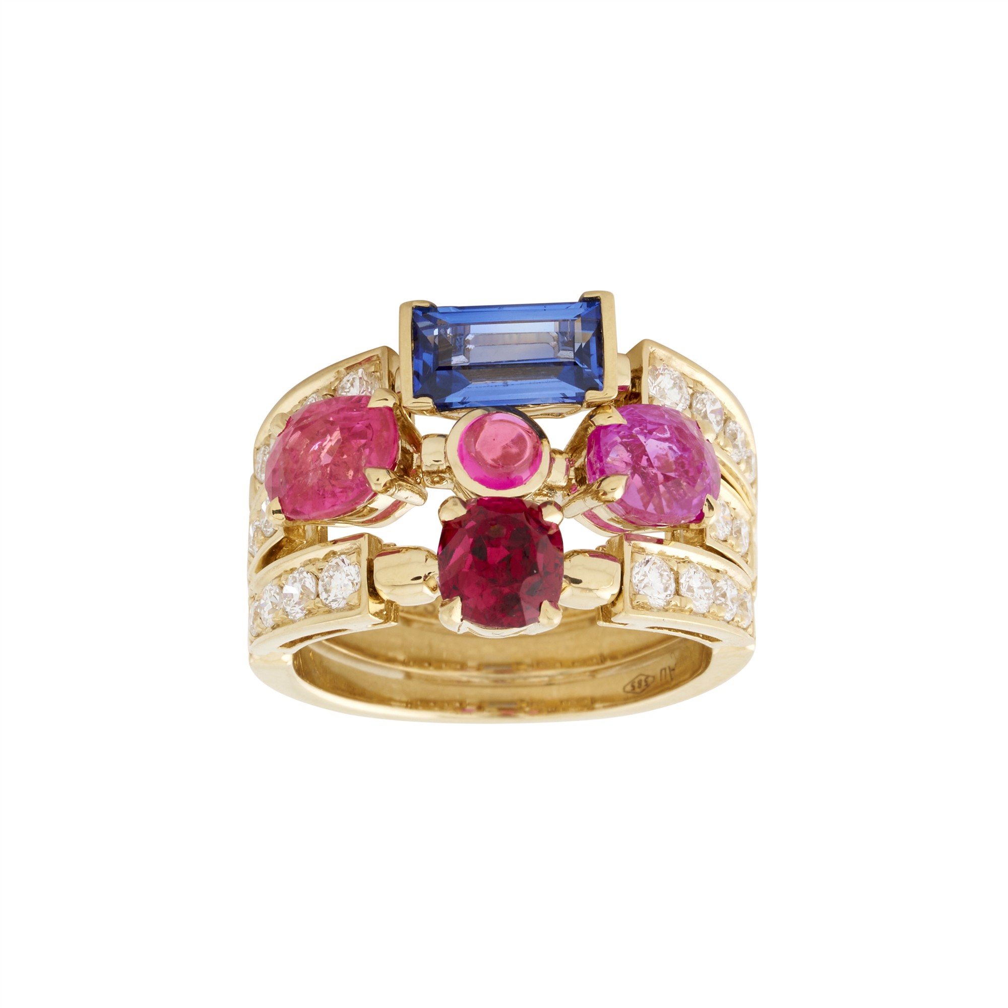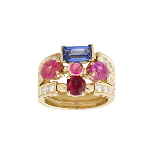 Styled as three stacking rings of individual gem-set combinations comprising a cushion-cut sapphire, a pink sapphire en-cabochon flanked by two oval pink sapphires and a claw-set modified brilliant-cut spinel, each with claw-set brilliant-cut diamond bands to a tapered shank,