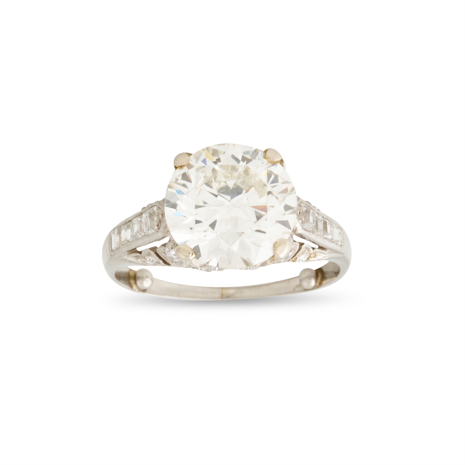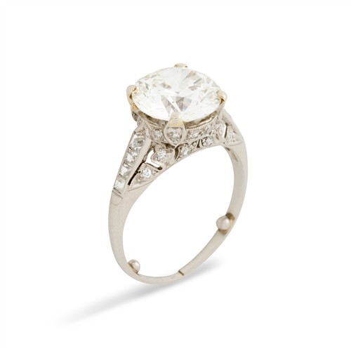 Centring a claw-set early brilliant-cut diamond weighing approximately 3.40 carats, to ornate pierced shoulders millegrain-set with step and single-cut diamonds, the small diamonds together weighing approximately 0.82 carats, mounted in platinum, size K, gross weight approximately 4.7 grams.