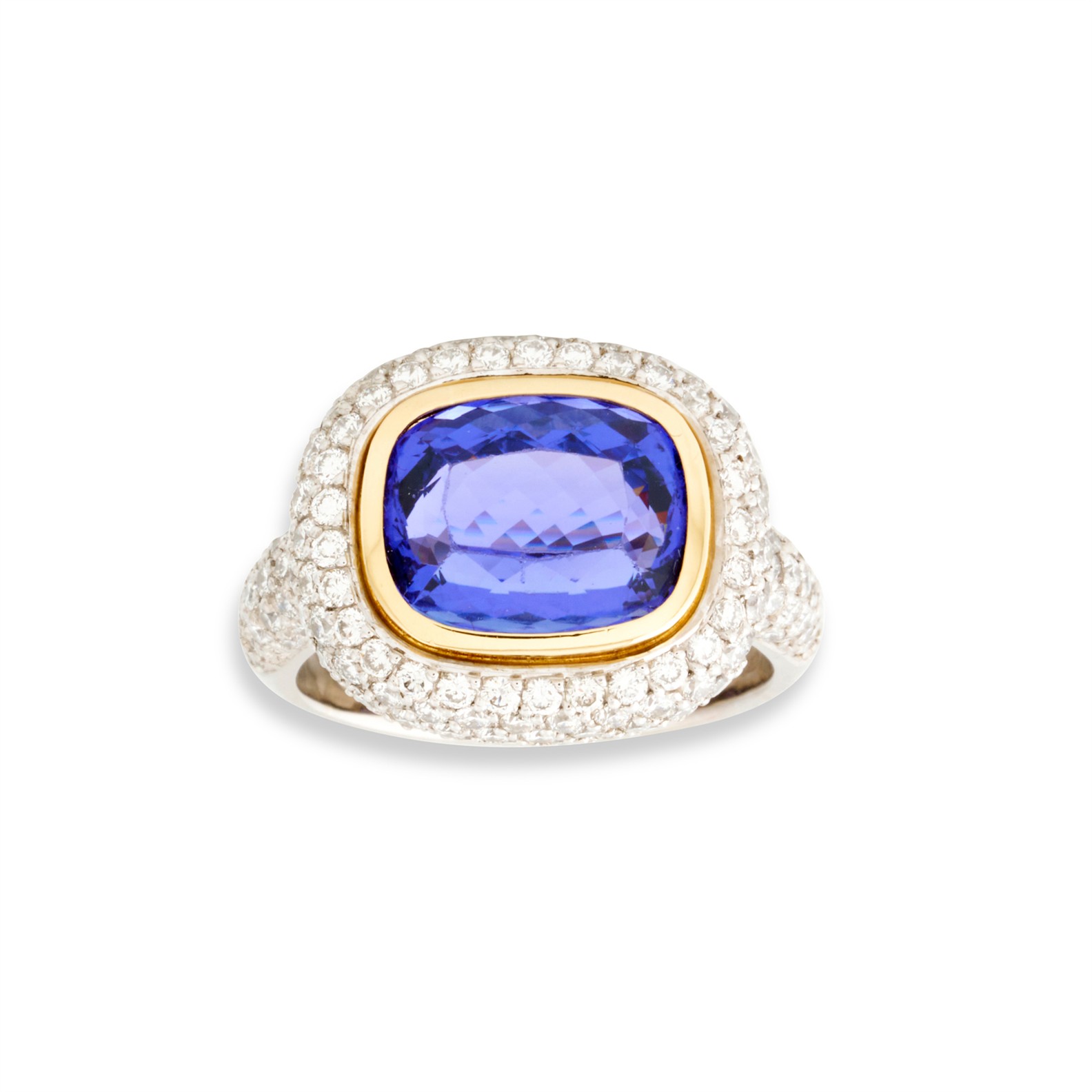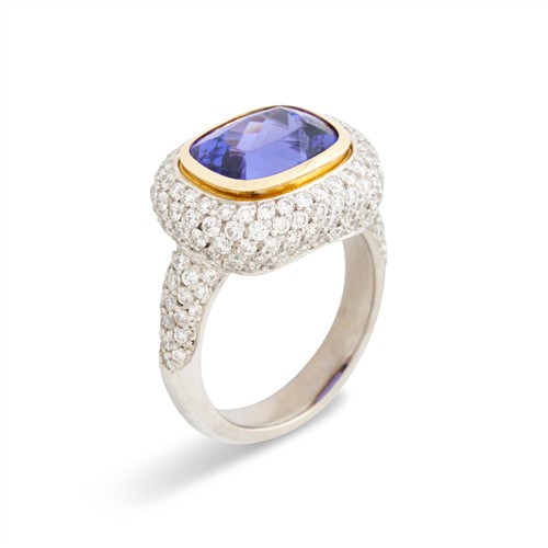 Of cluster design, centring a collet-set cushion-shaped tanzanite, weighing approximately 8.30 carats, framed by pavé-set brilliant-cut diamonds, to shoulders similarly set, the diamonds together weighing approximately 1.60 carats, mounted in 18ct yellow and white gold, size N1/2, gross weight approximately 13.5 grams.