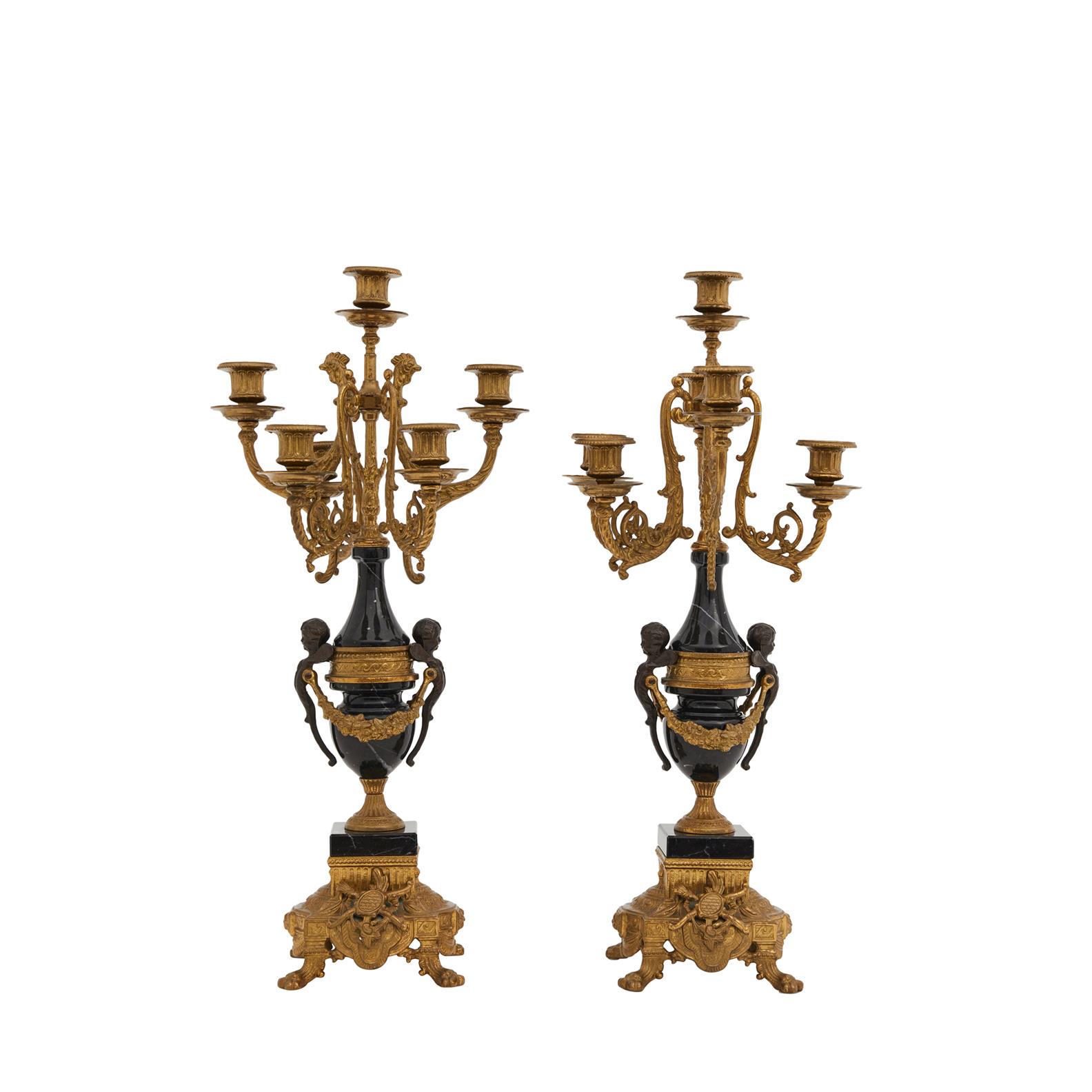 Each with lion paw feet, winged putto handles and scrolled candle branches.