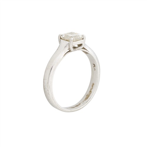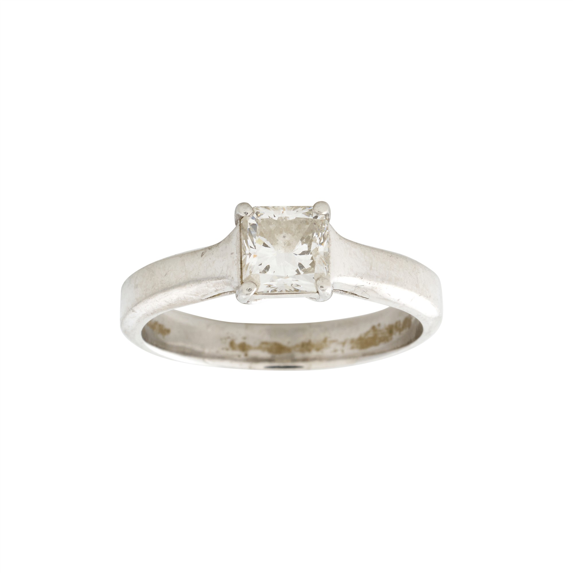 The central princess cut diamond is of good cut and is devoid of chips and abrasions. The claws are straight and secure with no evidence of damage. The diamond is secure in the setting. The band is robust and sturdy holding the setting. There is evidence of markings from wear on the band.