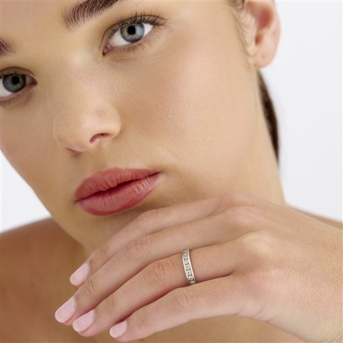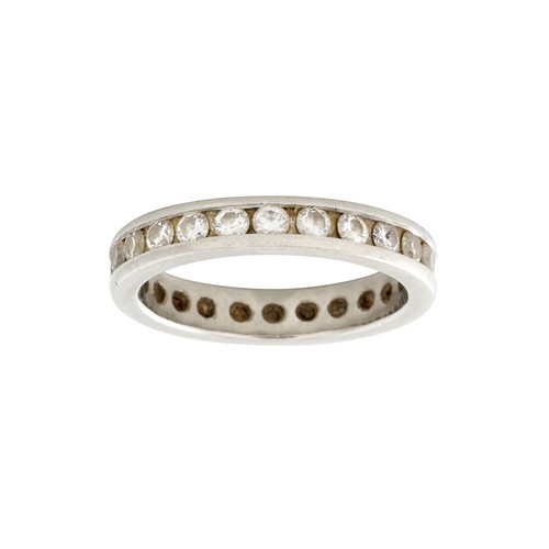 The full circle channel set wedding band shows markings from wear on the metal edges. the diamonds are devoid of chips and abrasions and are set securely under the channels.