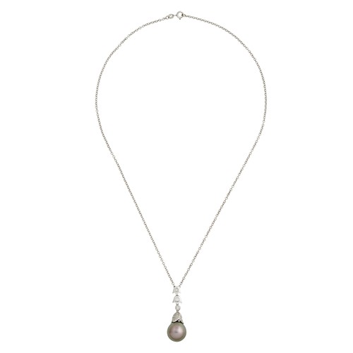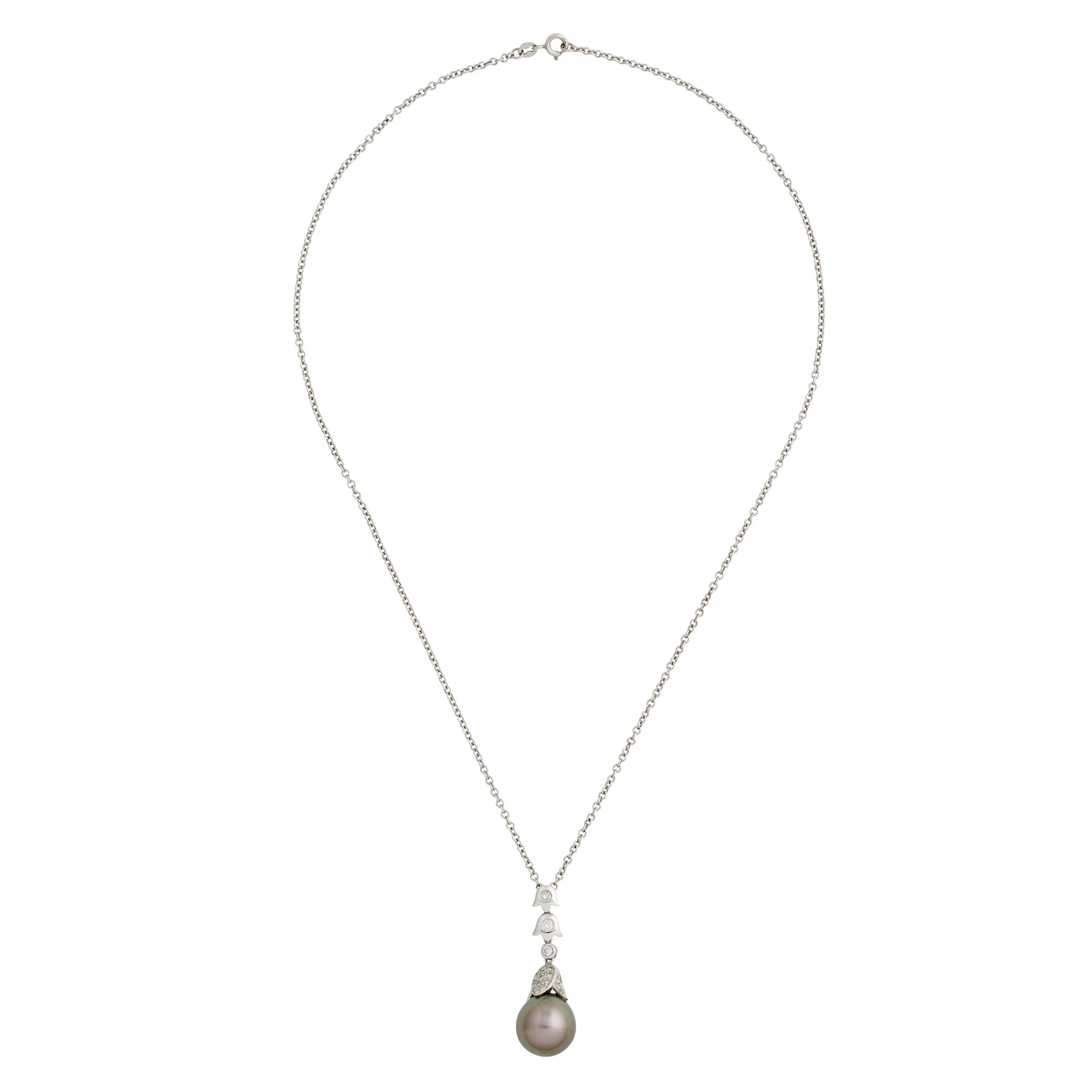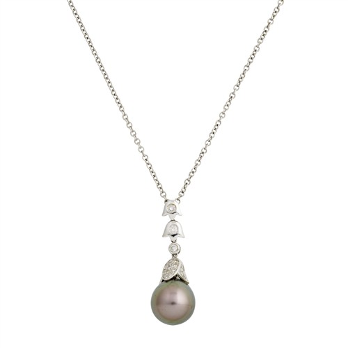 Centring a round Tahitian pearl, measuring approximately 14.0mm, to a pavé-set diamond accent and a graduating, articulated foliate motif, set with round-brilliant cut diamonds, suspended from a belcher link chain, completed by a bolt ring clasp, length 480mm, gross weight approximately 10.7 grams.