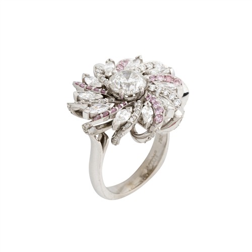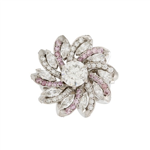 Centring an Ideal round brilliant-cut diamond weighing approximately 1.94 carats, surrounded by a floria design of twenty-five fancy Argyle pink diamonds, ten marquise-cut diamonds and sixty-five round brilliant-cut diamonds to a band with swept up shoulders, the diamonds together weighing approximately 4.03 carats,