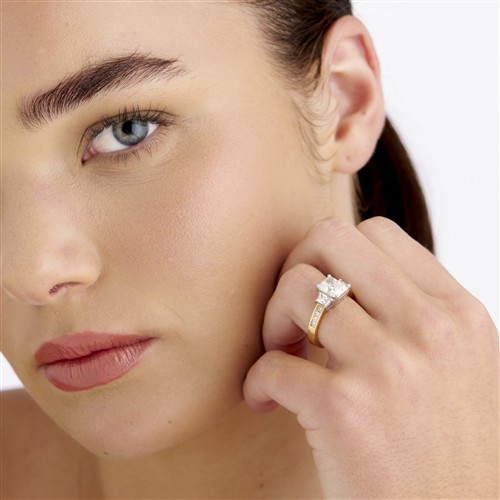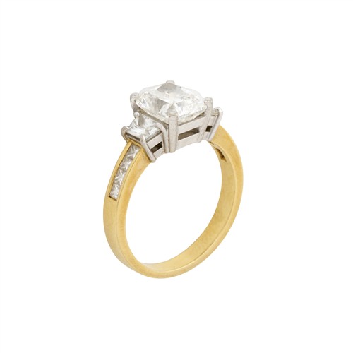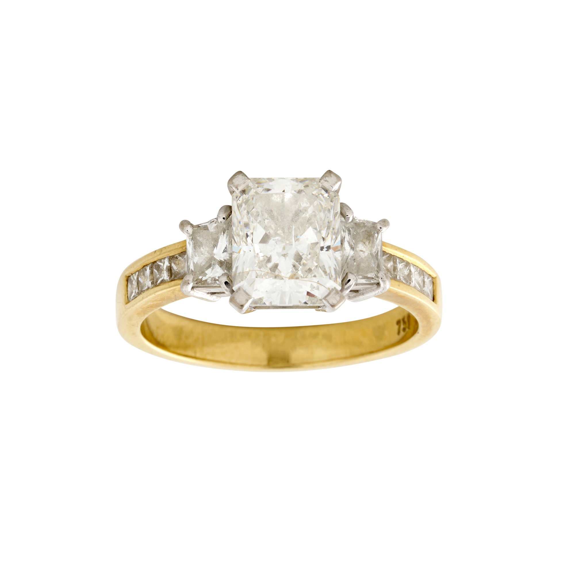 Centring a rectangular modified brilliant-cut diamond of approximately 2.51 carats, flanked by two trapezoid-cut diamonds together weighing approximately 0.61 carats to a channel-set band comprising of an additional eight princess-cut diamonds, the diamonds together weighing approximately 3.42 carats, size P, gross weight approximately 6.0 grams.