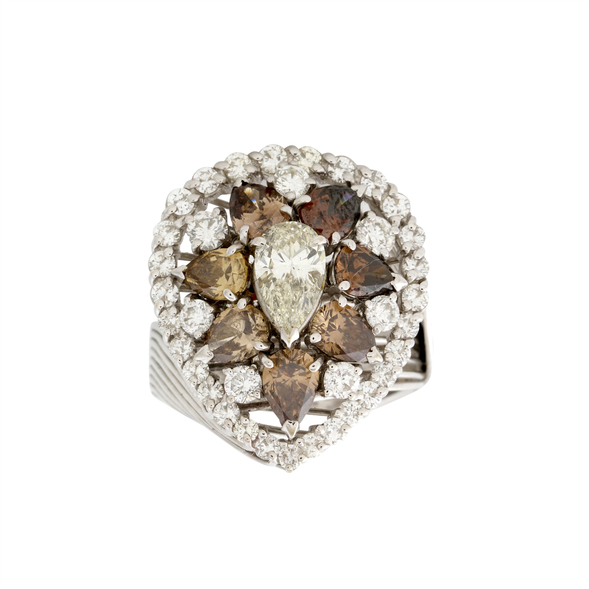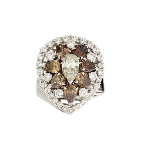 Centring a claw-set pear-cut diamond flanked by seven pear-cut champagne coloured diamonds with a further seven round brilliant-cut diamonds, additionally, a halo of twenty-nine shared-claw-set diamonds, to a bypass sweep band, the diamonds together weighing approximately 4.82 carats, size P1/2, gross weight approximately 11.8 grams.