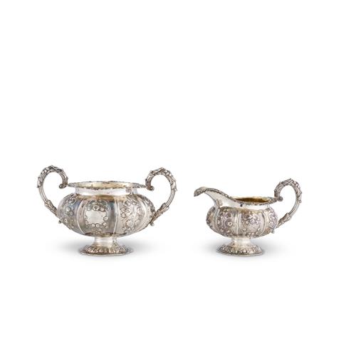 A tea pot, coffee pot, two-handled sugar basin, and cream jug, the lobed bodies with leaf-capped scroll handles and standing on a spreading circular feet, modelled with floral and foliate designs, the pots with finials of leaves and flowers